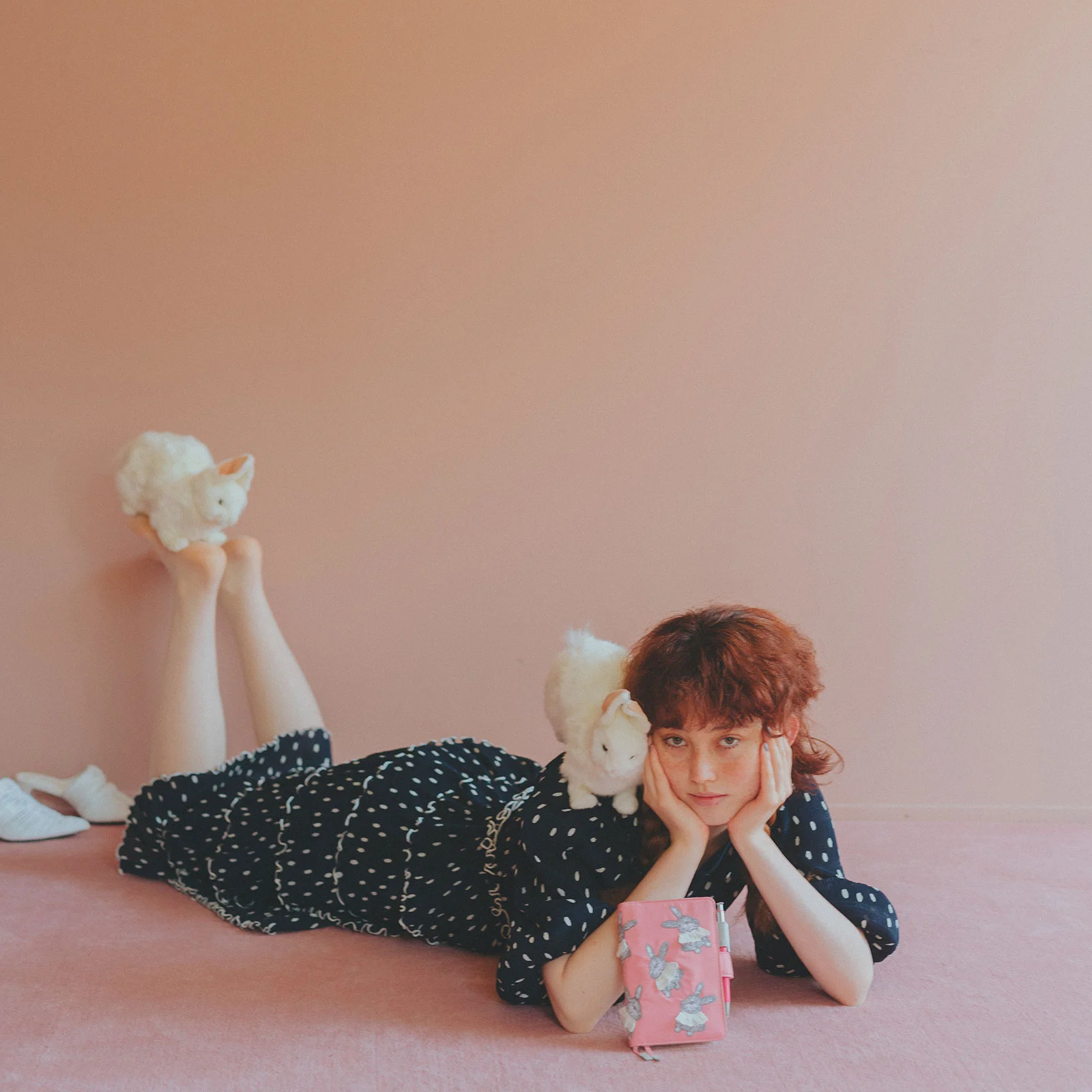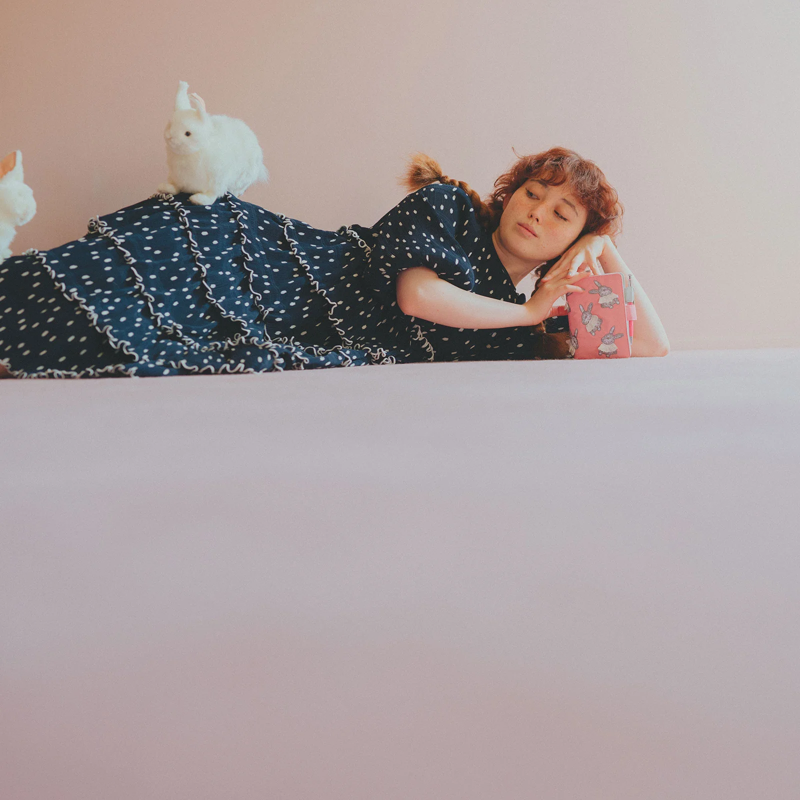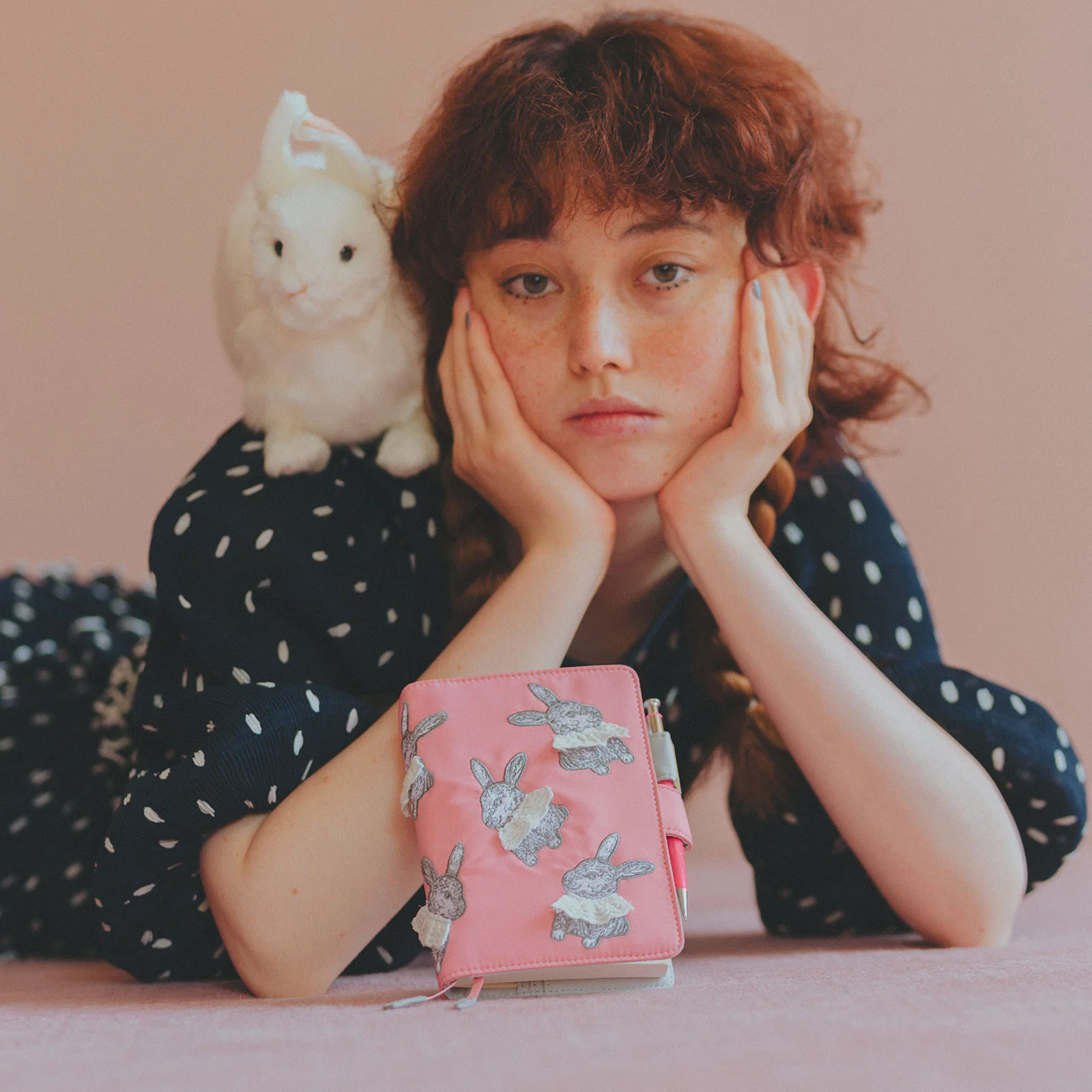 The rabbit with a striking presence sits on the cover with a smile on its face. You will never grow tired of looking at its perfectly balanced expression. The cuteness coming from the rabbit primly lining up its front feet is part of the charm too. Around the collar, real cotton lace is sewn on. It’s a Candy Stripper-like design to add playfulness to their items.