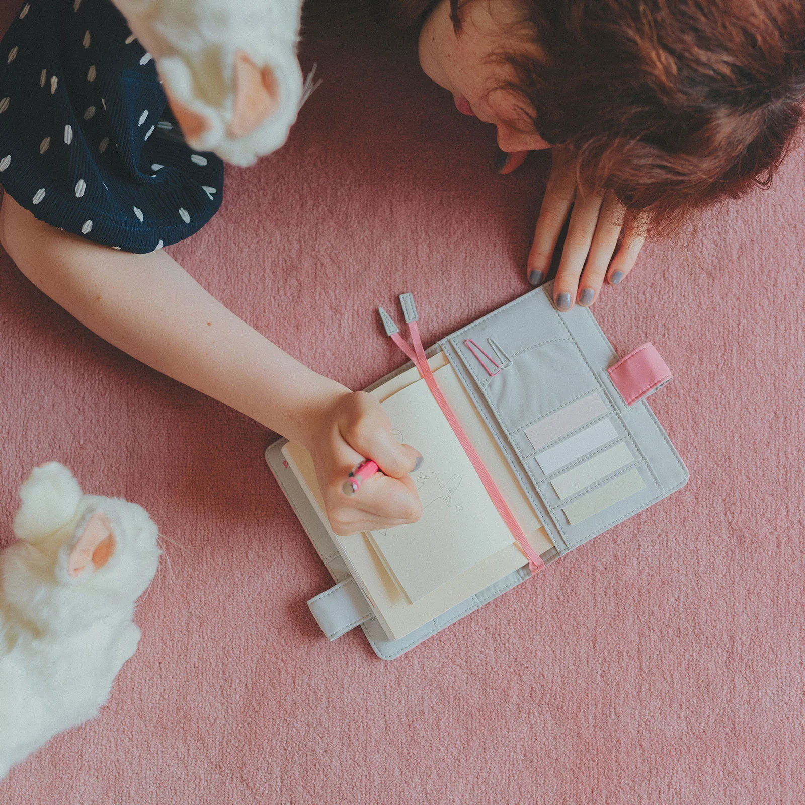 The “butterfly-stopper” pen holders are composed of two colors to match both the interior and exterior.
