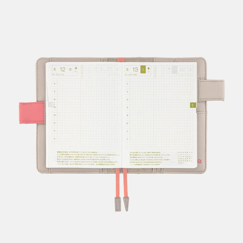 | Bonus Pages | Time Table / Graph Paper / Favorites / My 100 / Solar Terms / My Favorite Things / How to Better Enjoy Conversation / Enjoy Learning at the Hobonichi School / Emergency Preparedness / Conversion Chart / Getting the most of Hobonichi / Gifts / Age Table / Addresses (for 6 people) / Personal Notes |
