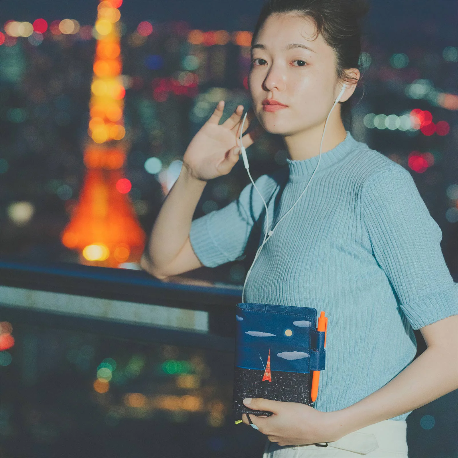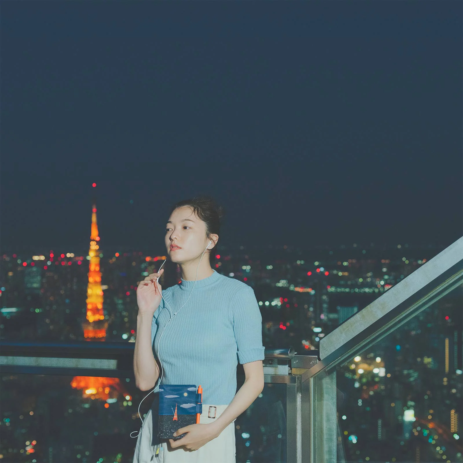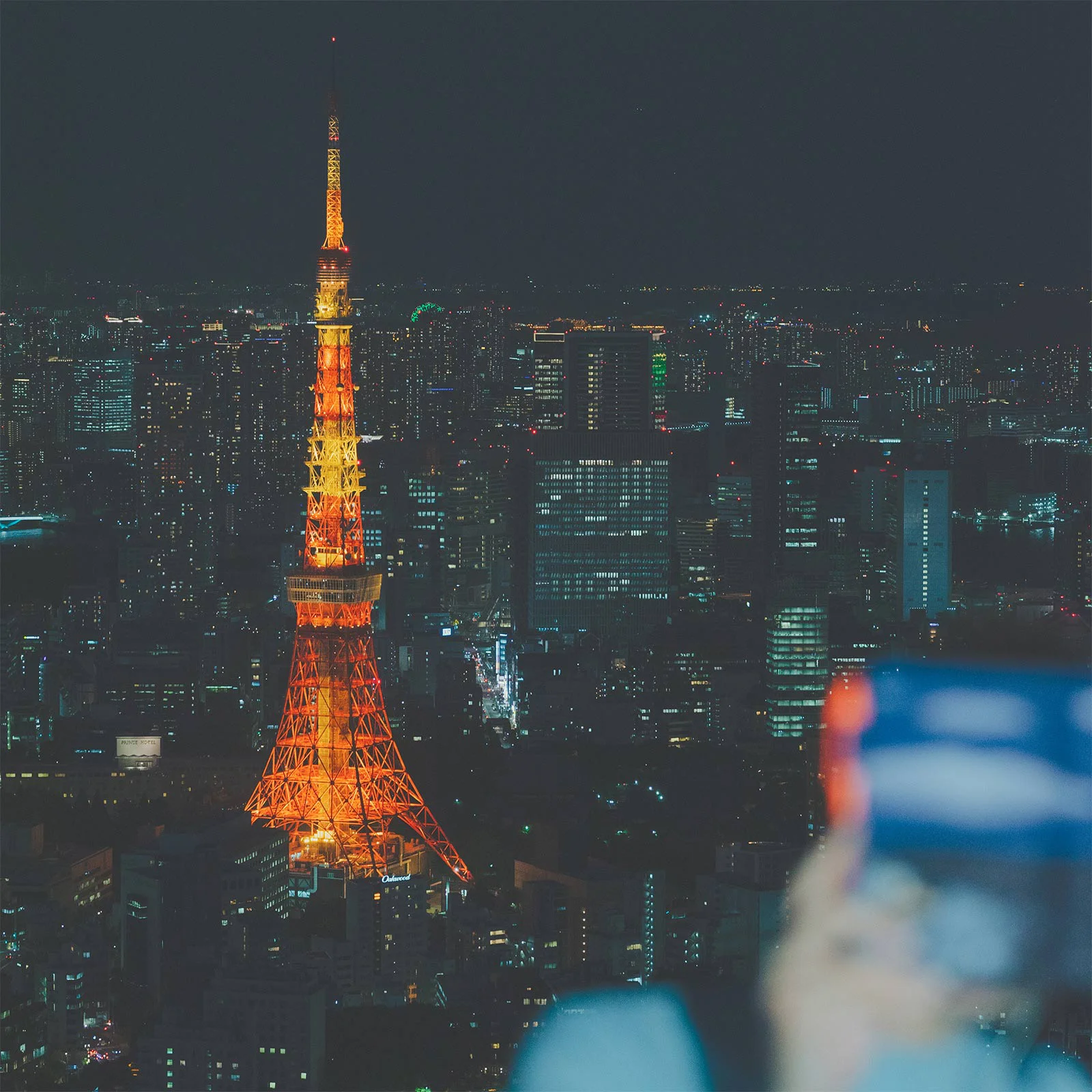 The full moon fills the night sky. Tokyo Tower sparkles underneath the light of the moon as it stands with a metronome needle attached. The lights from surrounding buildings encircle the rhythmic tower, and in the distance is a bright blue line along the horizon. Could that be the sea?