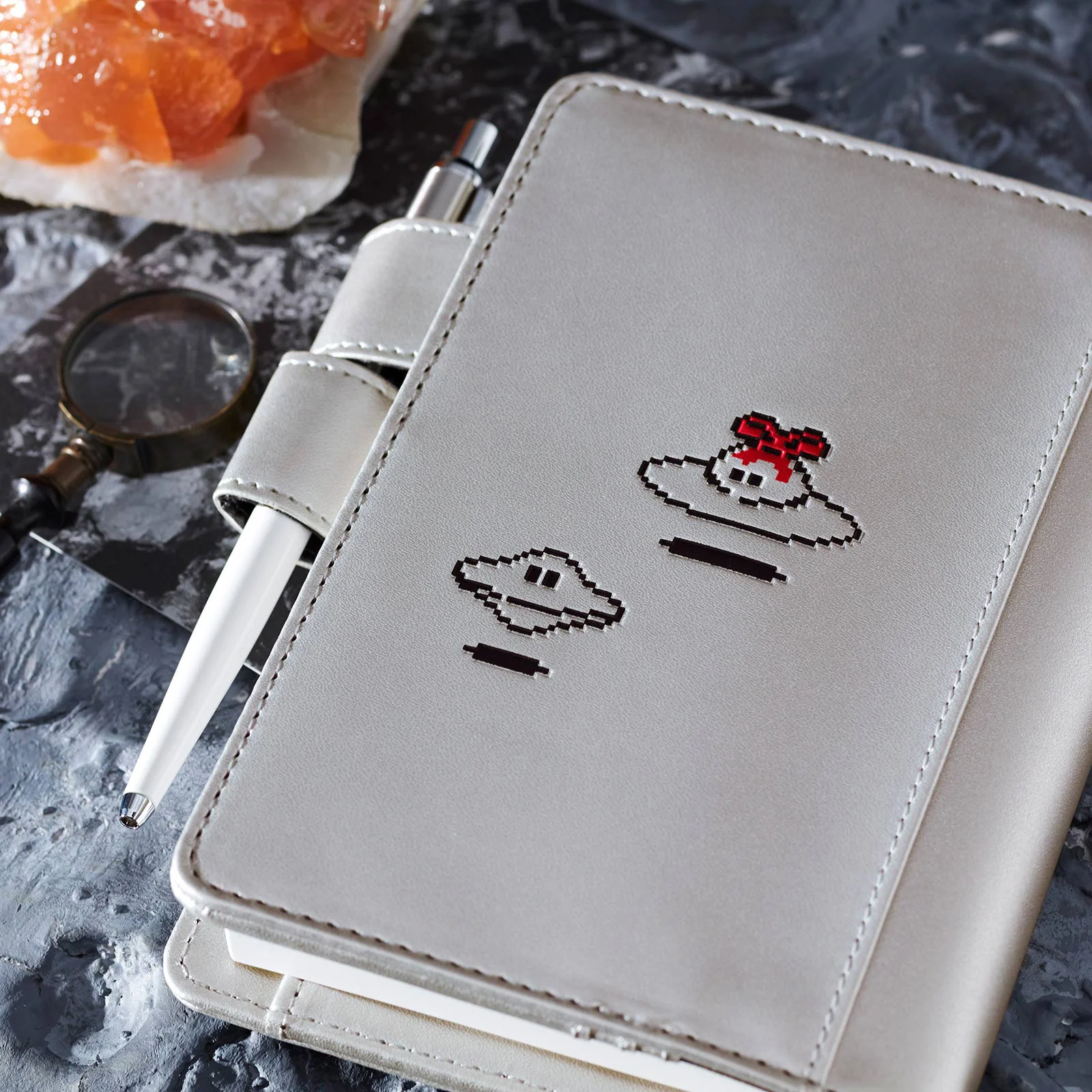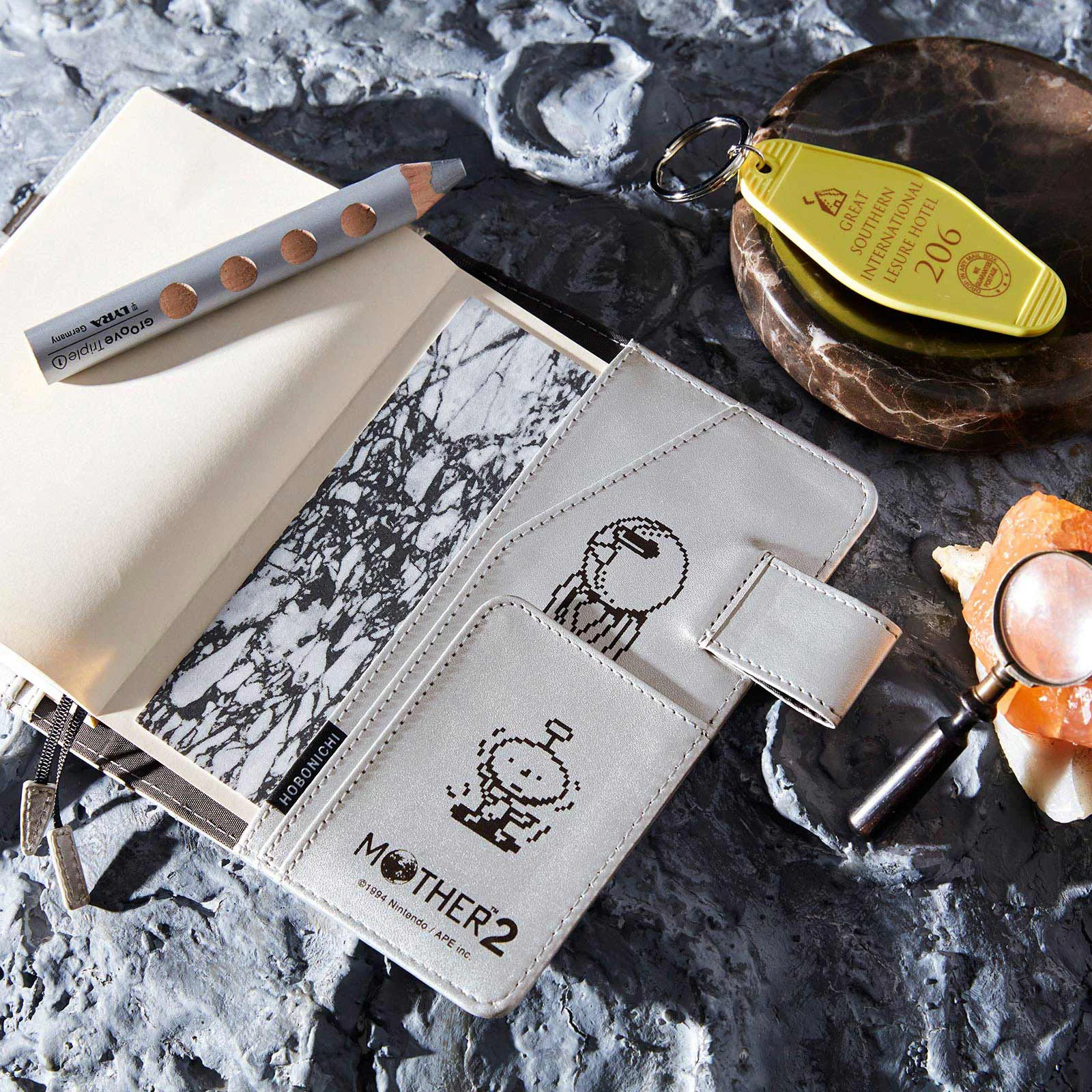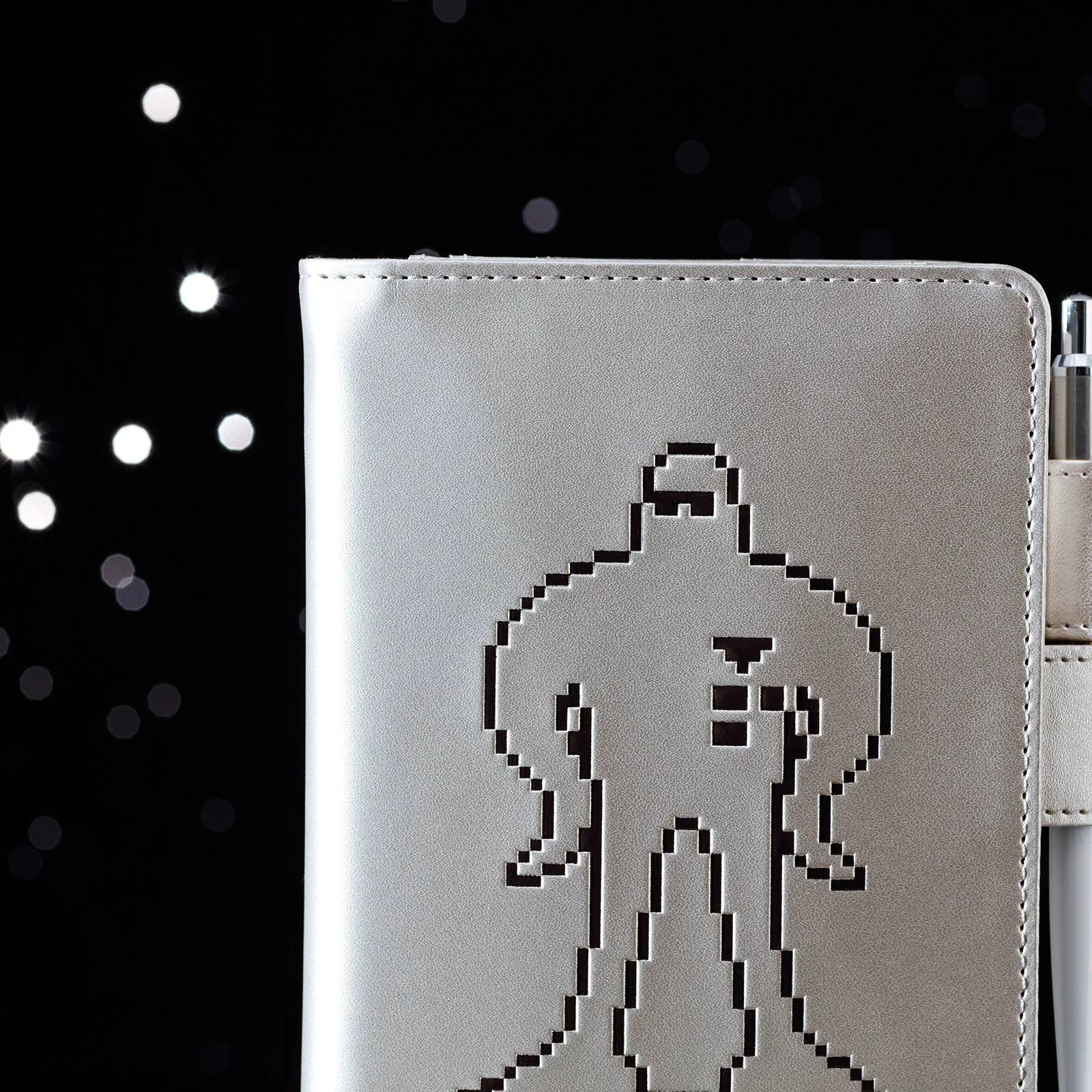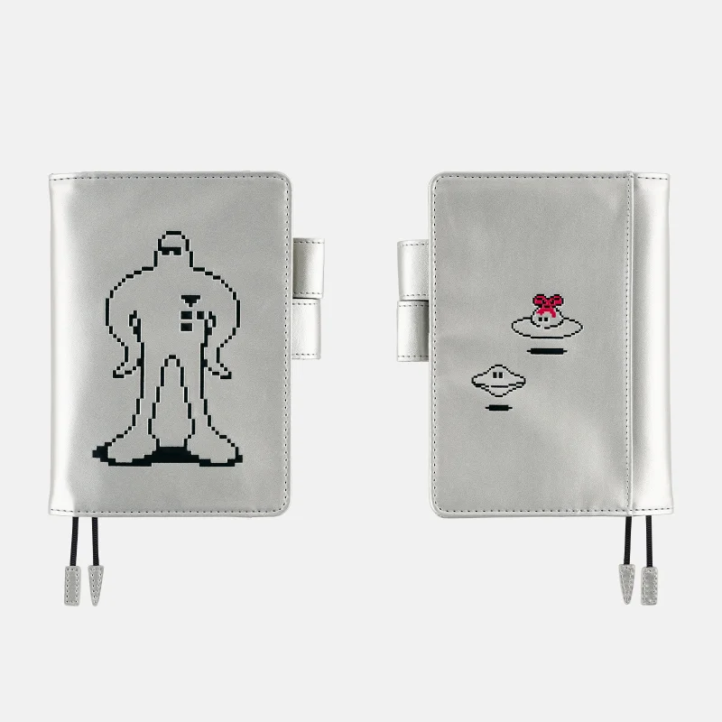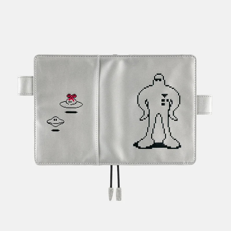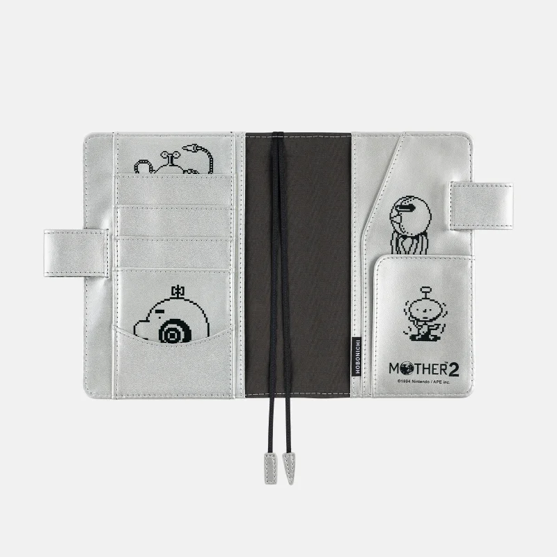 This cover design is based on Shigesato Itoi's 1994 Super Nintendo game, MOTHER 2 (EarthBound in North America). It’s made from a silver faux leather that sparkles in the light, giving it a futuristic look. One of the iconic characters from the series, a Starman, is blocking your path on the front.