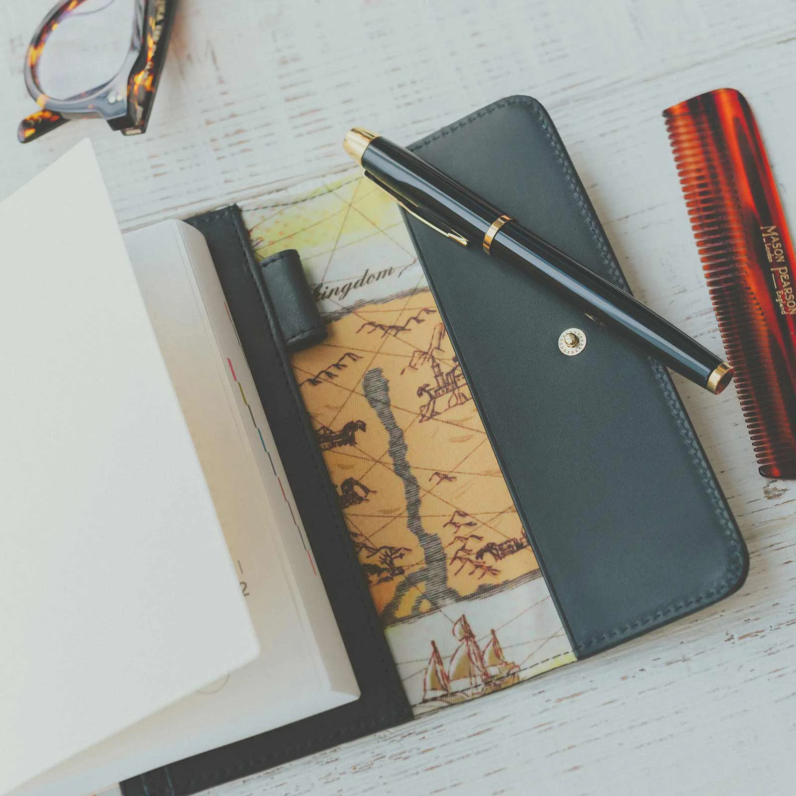 The cover interior contains a cloth section that’s printed with a nautical chart to give the cover the true feel of a logbook. There’s a pen hook on the right-hand side to store a pen.