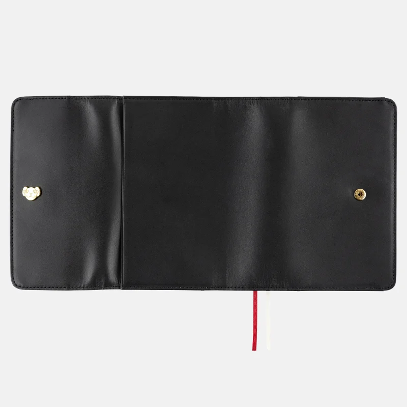 The left-hand side contains several card pockets. The phrase “Vivre Card” is foil-pressed on the bottom left of the pockets because you can store items here that are as important as a Vivre Card. The bookmarks have red and off-white ribbons to match the colors of the Going Merry ship flag.