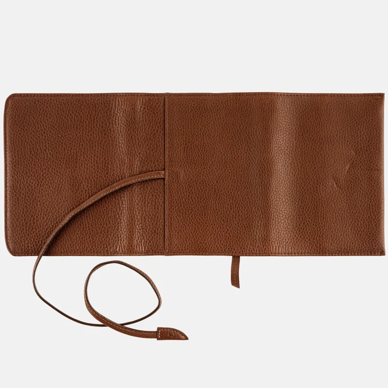 The cover is closed by wrapping a leather string around it. Enjoy taking your time to unwind the leather strap to open your techo and fastening it shut.