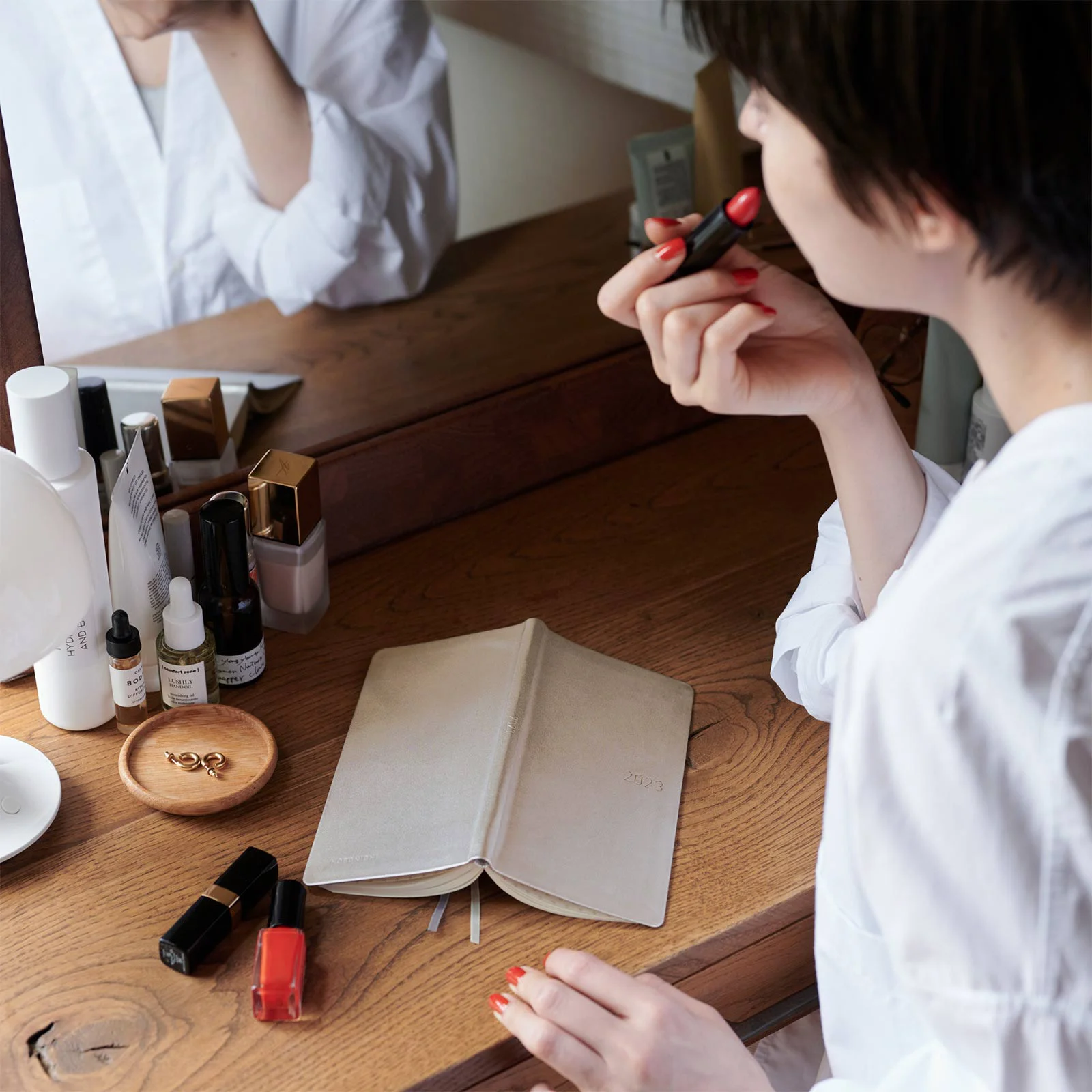 Silver White is made from cow leather, with a dazzling silver finish that gives the fine natural wrinkles of leather an expressive sparkle. Despite its gorgeous looks, it gives an impression of elegance rather than gaudiness. The year 2023 is foil-pressed in silver and matches well with the cover color.