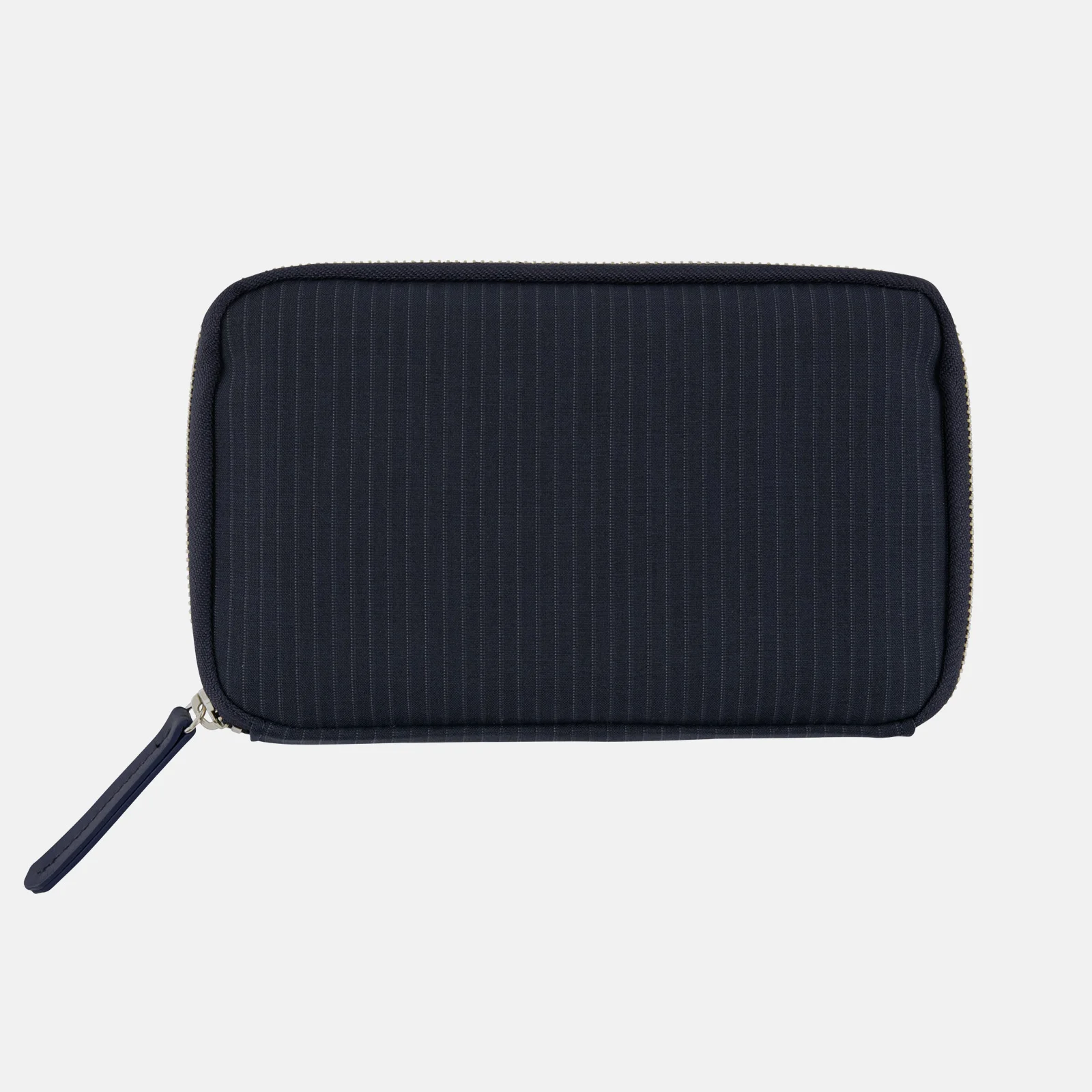 Suit Fabric: Navy Stripes is a Drawer Pouch specially made with high-quality suit fabric called Cordura Combat Wool, a high-quality textile that is stronger than wool. The simple yet stylish navy color overlaid with thin stripes provides a look that fits seamlessly into any setting. The pouch handle is made with navy leather. The pouch interior is a plain navy hue.