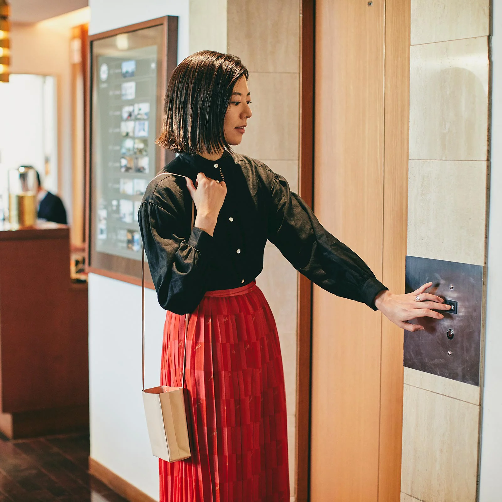 Carry it with you when you want to wander around the neighborhoods of your hotel or go down to have breakfast. Bring along your room keys, wallet, handkerchief, books, and the minimum items you need.