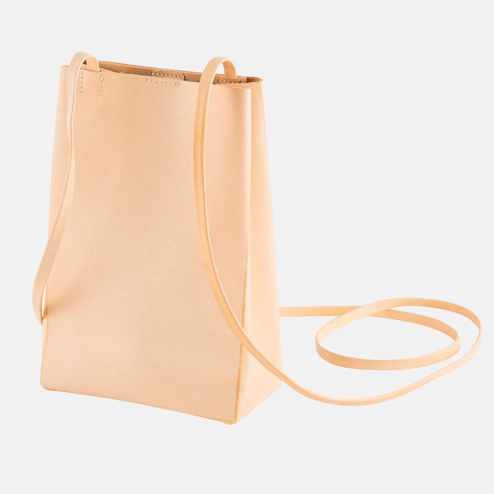 It has a thin leather strap to hang from your shoulder so you can keep your hands free while you carry around the items you need. You can adjust the length of the strap by tying the edges.