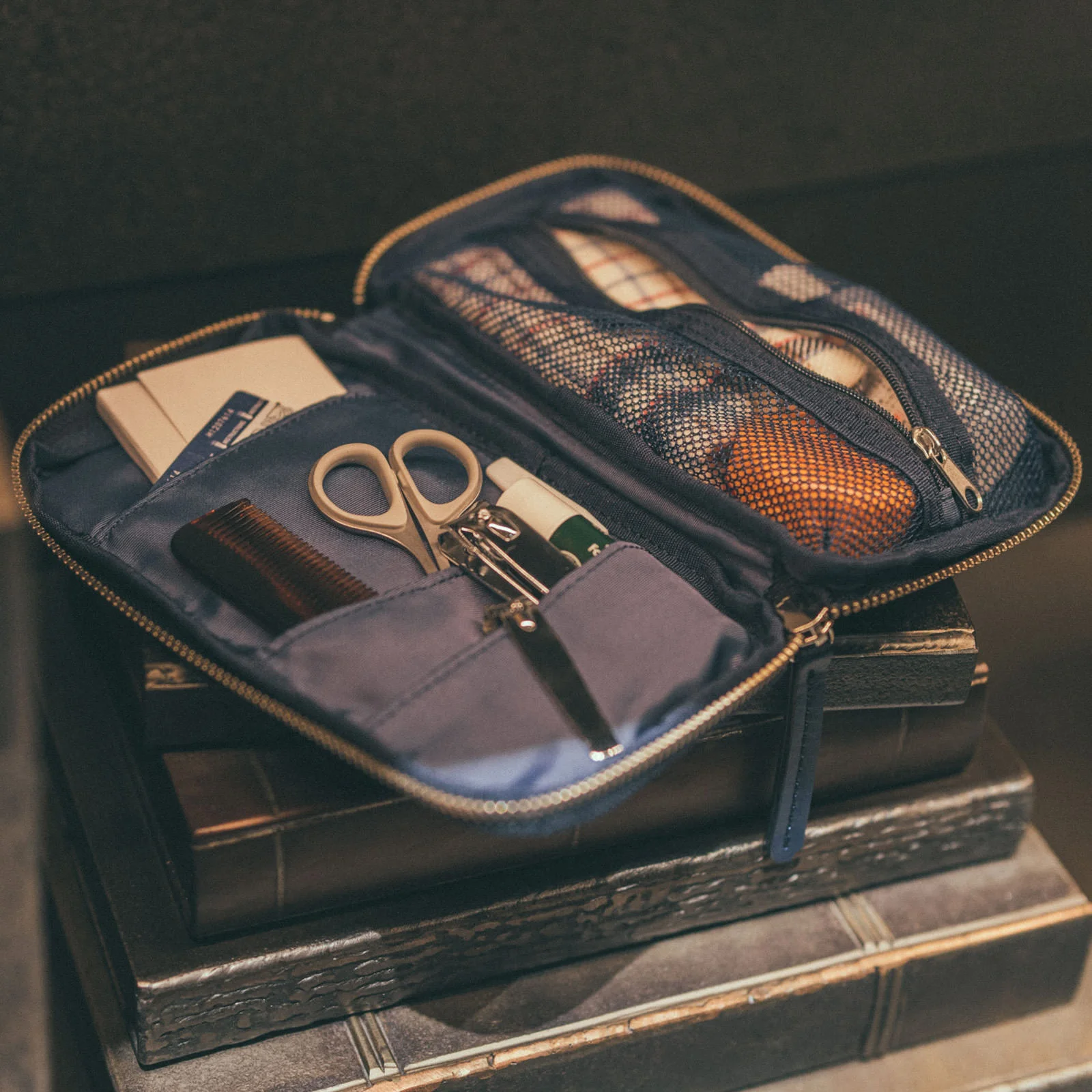 Suit Fabric: Navy Stripes is a Drawer Pouch specially made with high-quality suit fabric called Cordura Combat Wool, a high-quality textile that is stronger than wool. The simple yet stylish navy color overlaid with thin stripes provides a look that fits seamlessly into any setting. The pouch handle is made with navy leather. The pouch interior is a plain navy hue.
