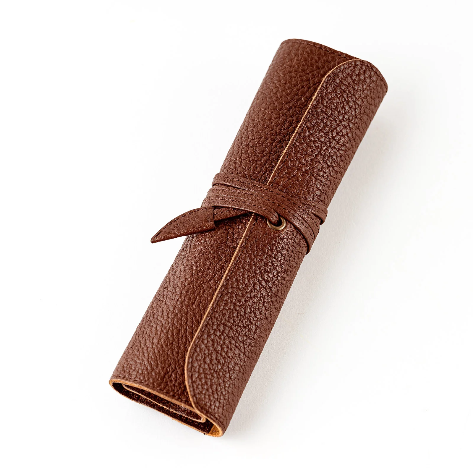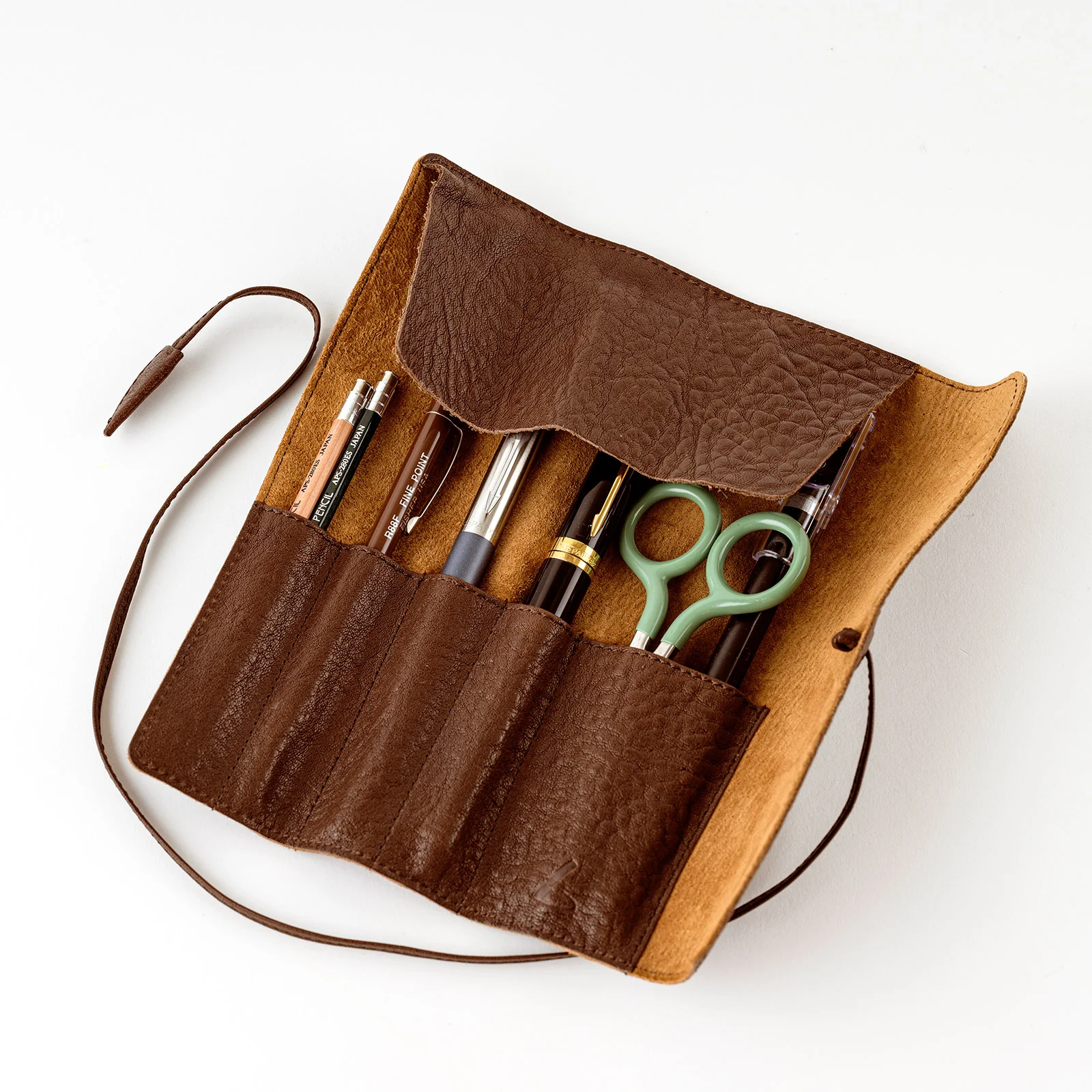 This pen case uses the same expressive “oil nume leather” as the Starter Techo cover. You can insert pens and other writing utensils in the case and roll it up before tying it shut with the leather string. The longer you use it, the smoother the natural leather becomes. And repeatedly tying and untying the leather string will give it a well-loved look. The leather’s color is a dark brown.