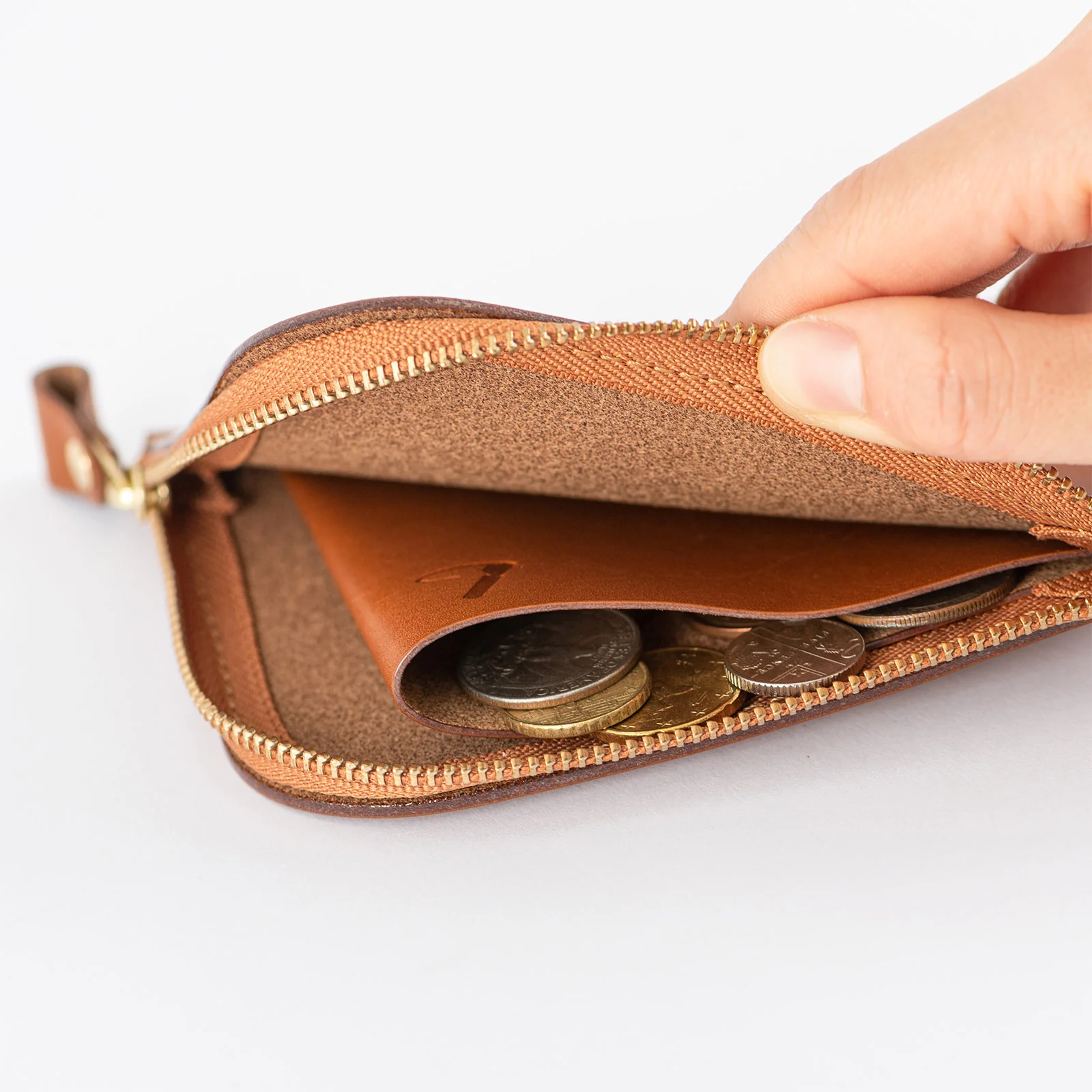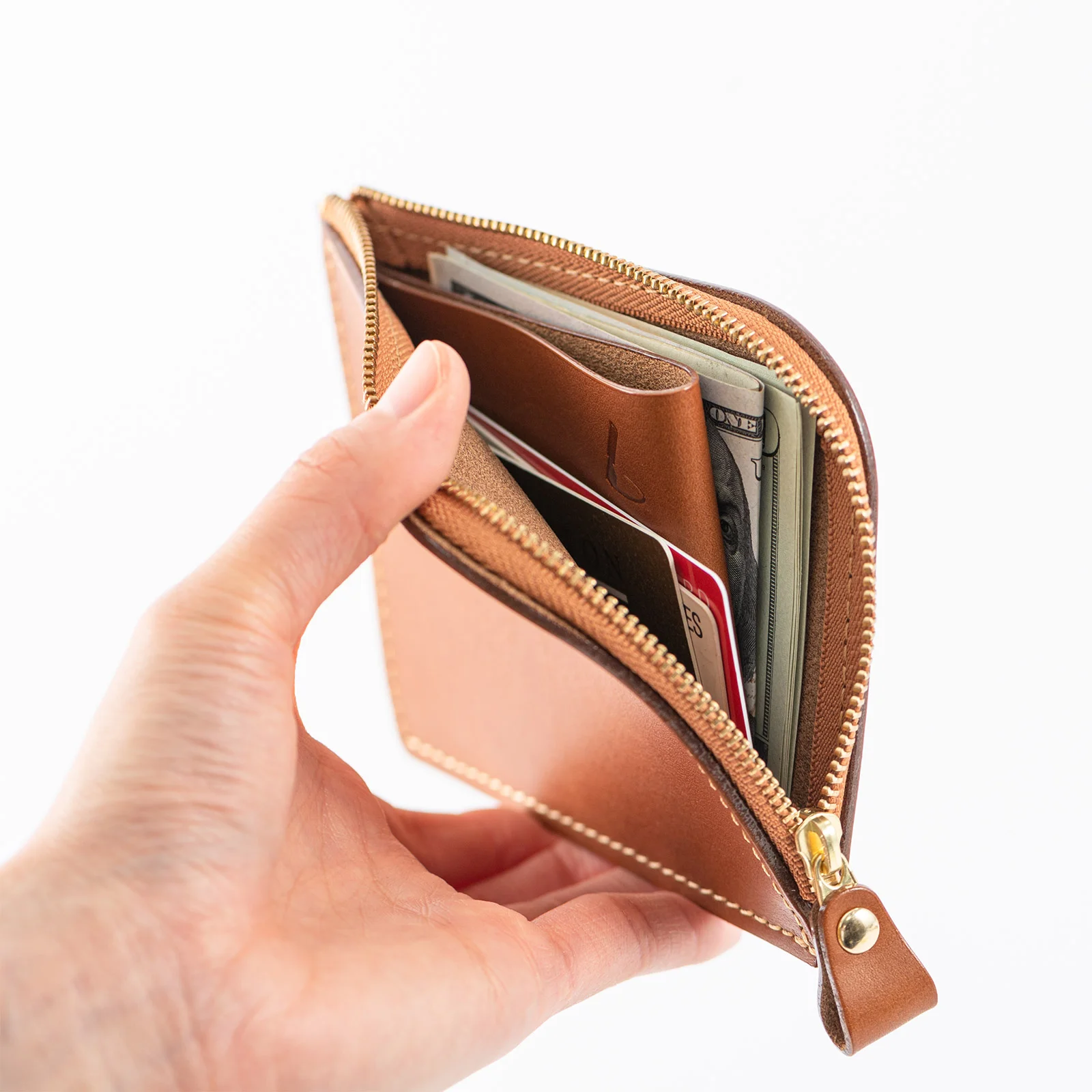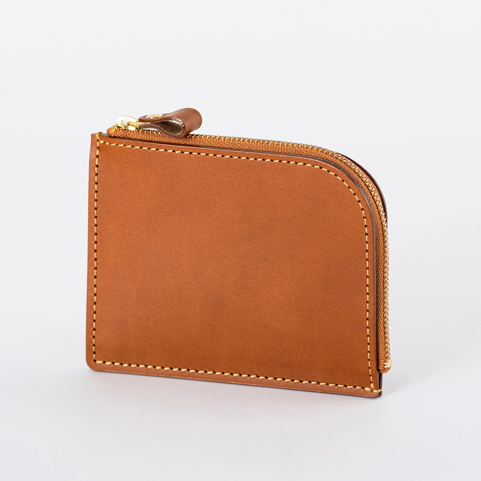 This compact, natural leather wallet allows you to fully enjoy the appeal of leather. The zipper runs along an L-shape of the wallet so you can open the wallet wide and easily access the contents. The large pocket can store coins, and the two areas separated by this pocket can store cards and currency. The longer you use it, the deeper the color and shine become. The leather’s color is a light brown.