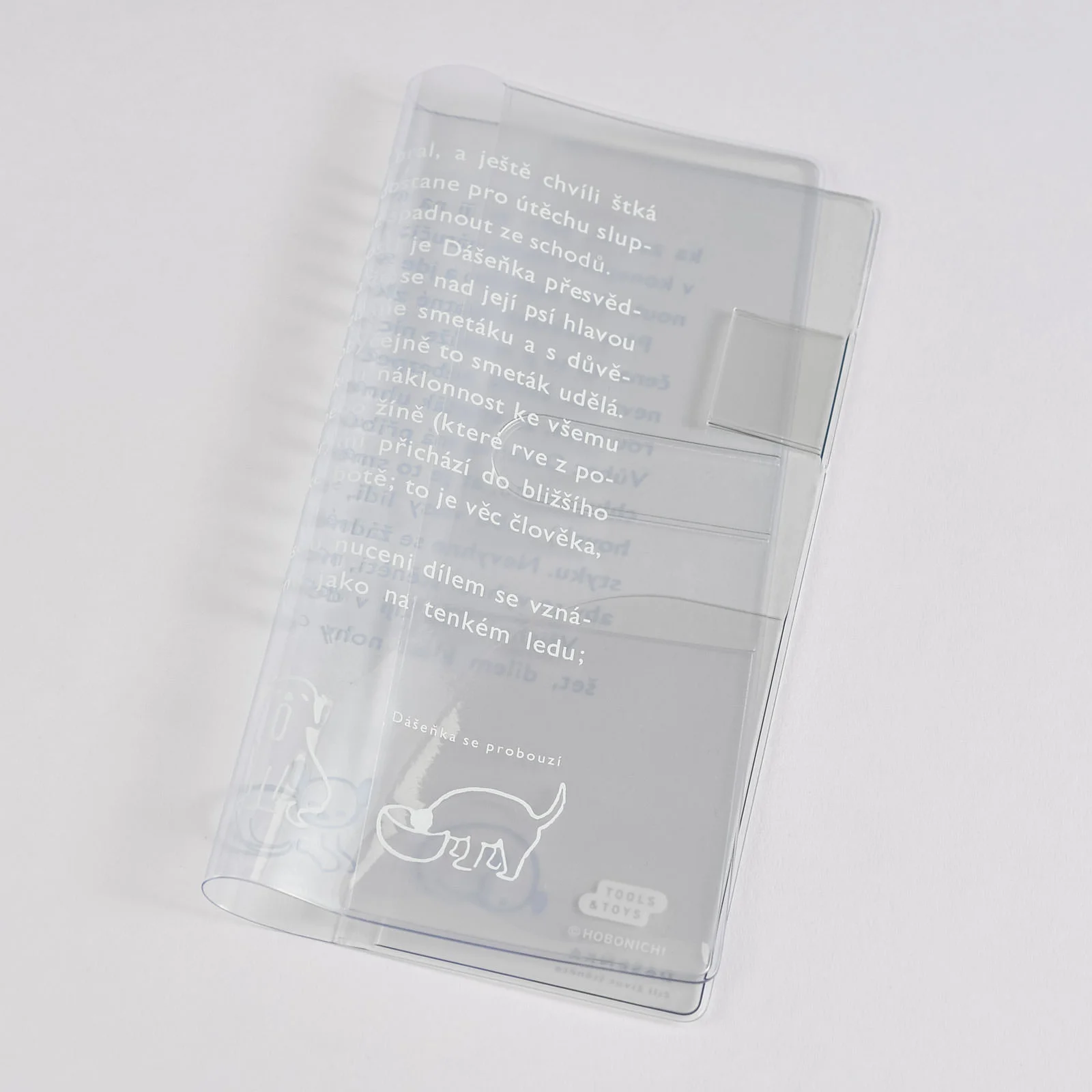 This Clear Cover is adorned with illustrations from the book Dashenka: The Story of a Puppy by Czech author Karel Capek (1890-1938), who also illustrated the book himself. The design emulates a page from the book’s 1971 reprint. The line art is simple yet perfect at capturing the carefree life of a puppy.