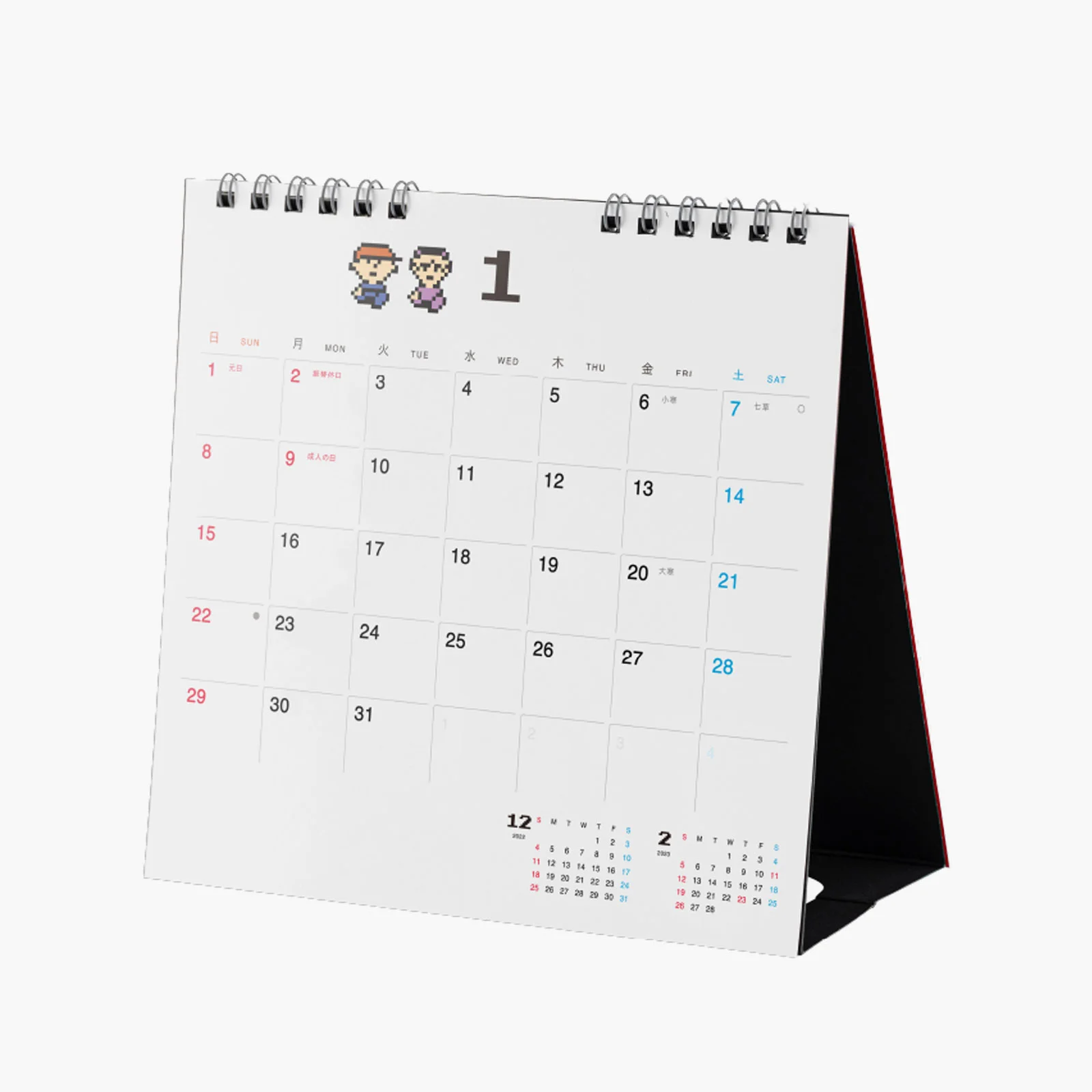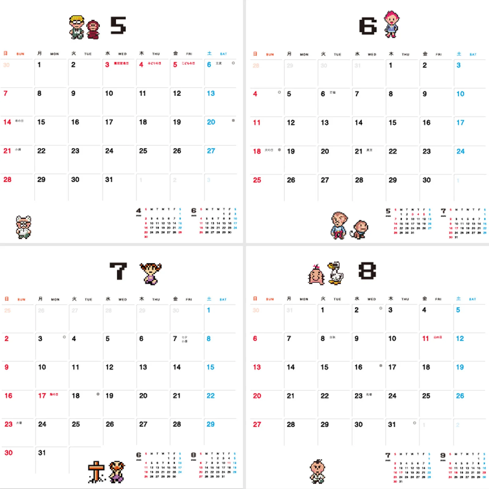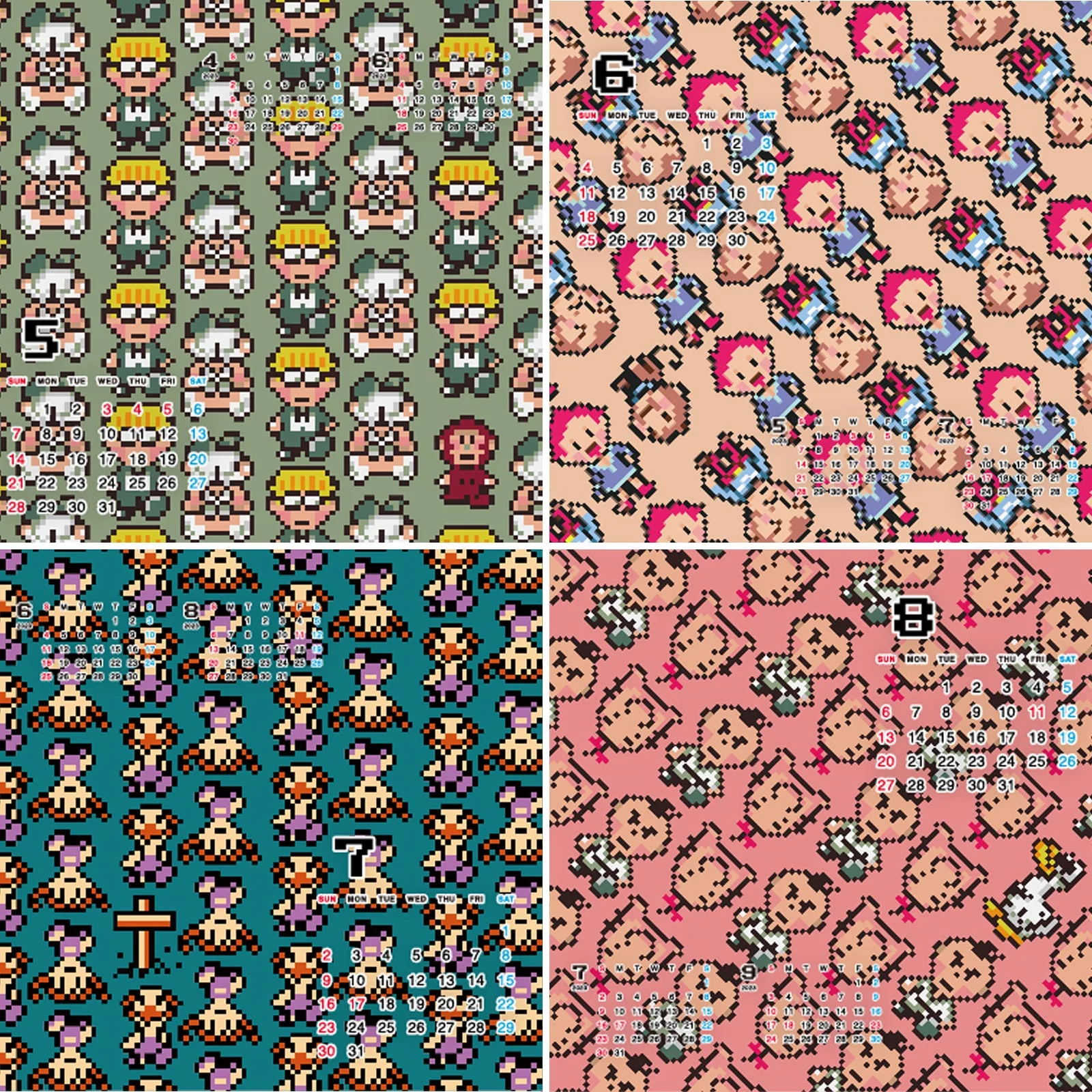 The Desktop size includes characters from across the MOTHER trilogy. The double-sided pages are made with whiteboard paper, with one side a calendar with repeating images of characters from the game, the opposite side a white calendar with single images of those characters and plenty of room to write. In other words, you get one calendar with two designs.