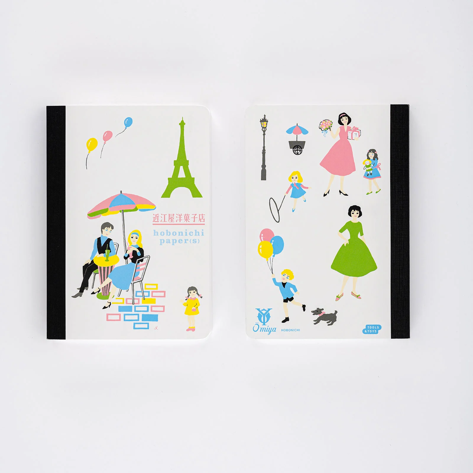 The cover of this notepad is modeled after the packaging of Omiya Yogashiten, a historical and beloved sweets shop in Kanda, Tokyo. The cute yet elegant illustration matches the design of the techo cover. It shows a man and woman relaxing on a terrace, a boy playing with a dog, women and girls dressed up nicely, and other scenes drawn with pastel colors that will brighten your day.