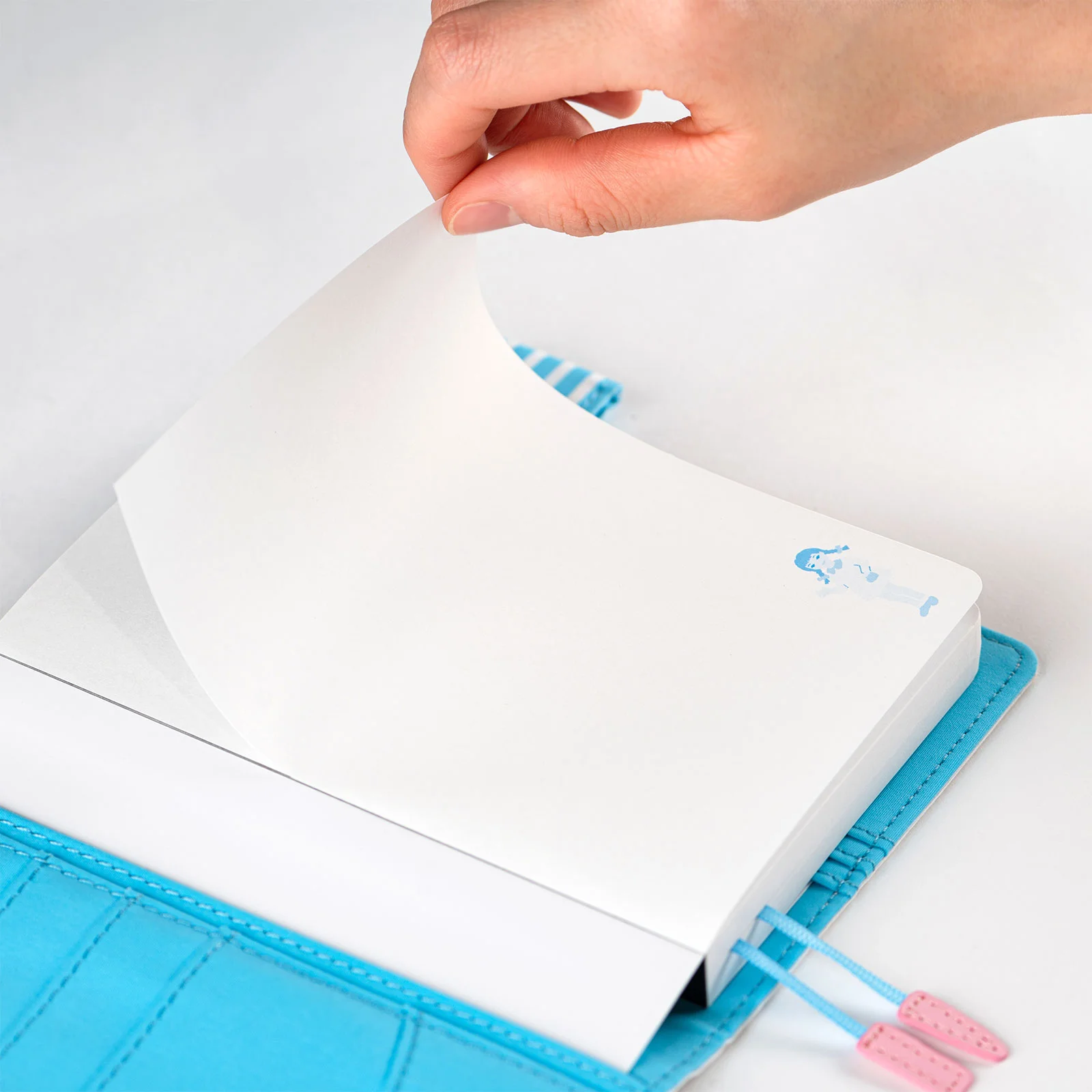 This A6 notepad has 155 pages. The paper inside is blank except for a lightly printed illustration, and the pages are glued in instead of sewn, making them very easy to rip out for shopping lists or passing along messages.
