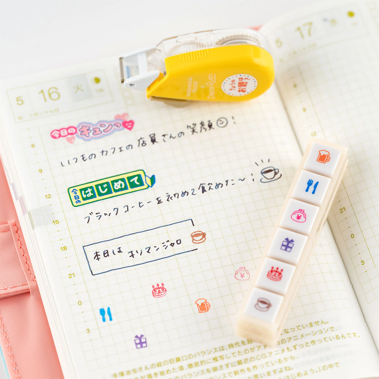 Pochitto6 Push-Button Stamp (Schedule Book) has six icons to manage your daily schedules with ease. These stamps are self-inked, so you’ll be able to stamp icons easily by simply placing the stamp over where you want to stamp it and pushing the button. Because each stamp uses a different color ink, it will add a fun touch of color to your techo.