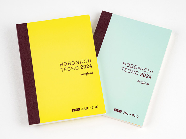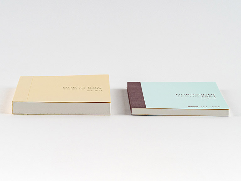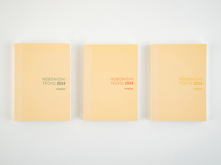 The front has a soft ivory hue, and features the label “HOBONICHI TECHO 2024 original” printed in gray letters if the book’s weekly calendars start on Monday and red if they start on Sunday. The April-start version includes the label “spring.”
