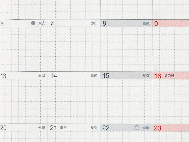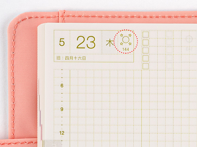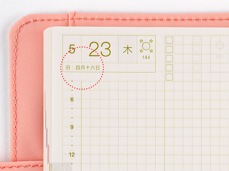 The date of the old Japanese lunisolar calendar is also included under the day’s date. This calendar was used in Japan until 1873, when Japan adopted the universal Gregorian calendar. Some days in this lunisolar calendar are specified as standard days signifying the changing of the seasons. We’ve also included solar terms based on this ancient calendar.