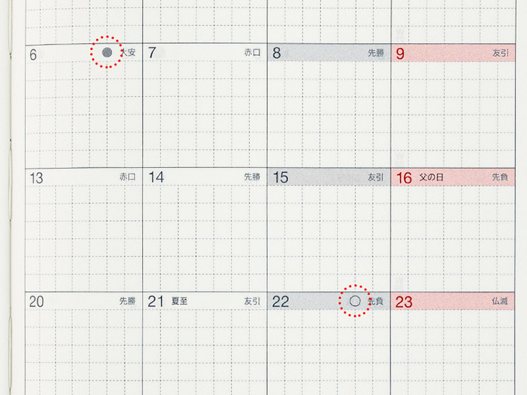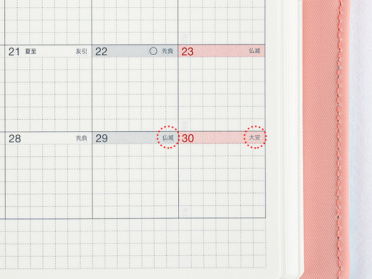The monthly calendar days are labeled with rokuyo, a cycle of six days said to predict good or bad fortune that day. The labels are commonly found on Japanese calendars and used to plan weddings and funerals.