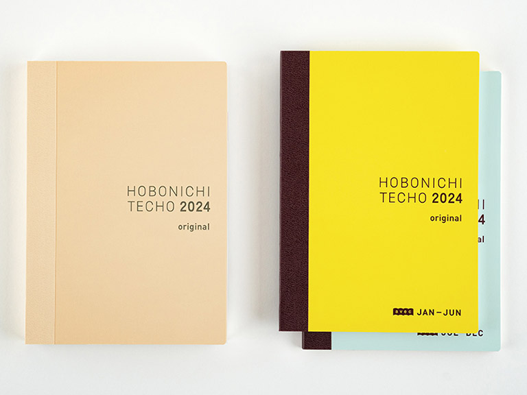 The front has a soft ivory hue, and features the label “HOBONICHI TECHO 2024 original” printed in gray letters if the book’s weekly calendars start on Monday and red if they start on Sunday. The April-start version includes the label “spring.”