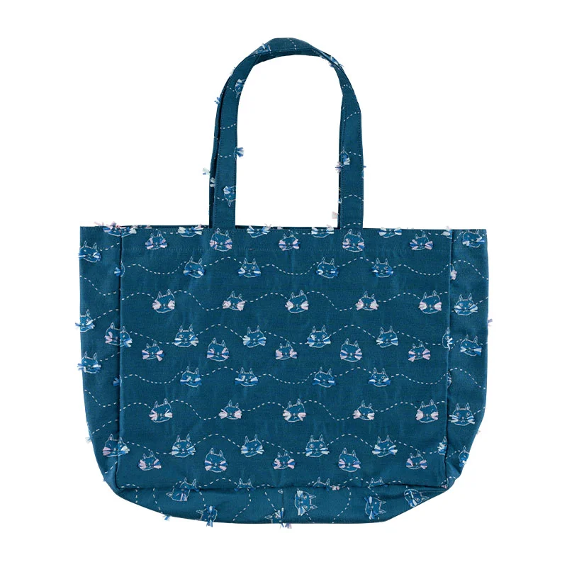 Whisker Cat places stitched images of cute cats and wavy lines against a deep blue background. The cats’ whiskers are made with white, pink, and light blue threads that have been cut one by one to the perfect length so you can enjoy the feel of the 3D effect against your fingertips. Look closely and you’ll see the faces of the cats vary, including some with wide eyes and some with narrowed eyes. The bag interior has a lustrous pink material to provide a charming contrast against the blue every time you open the bag.