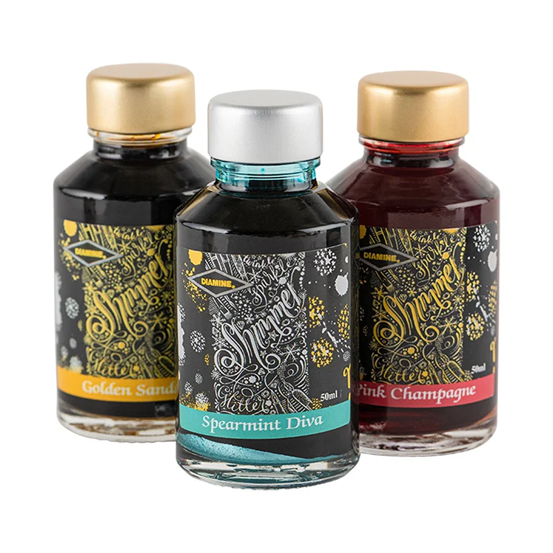 Out of the Diamine shimmering ink lineup, we chose three vibrant colors: “Spearmint Diva,” “Pink Champagne,” and “Golden Sands.”