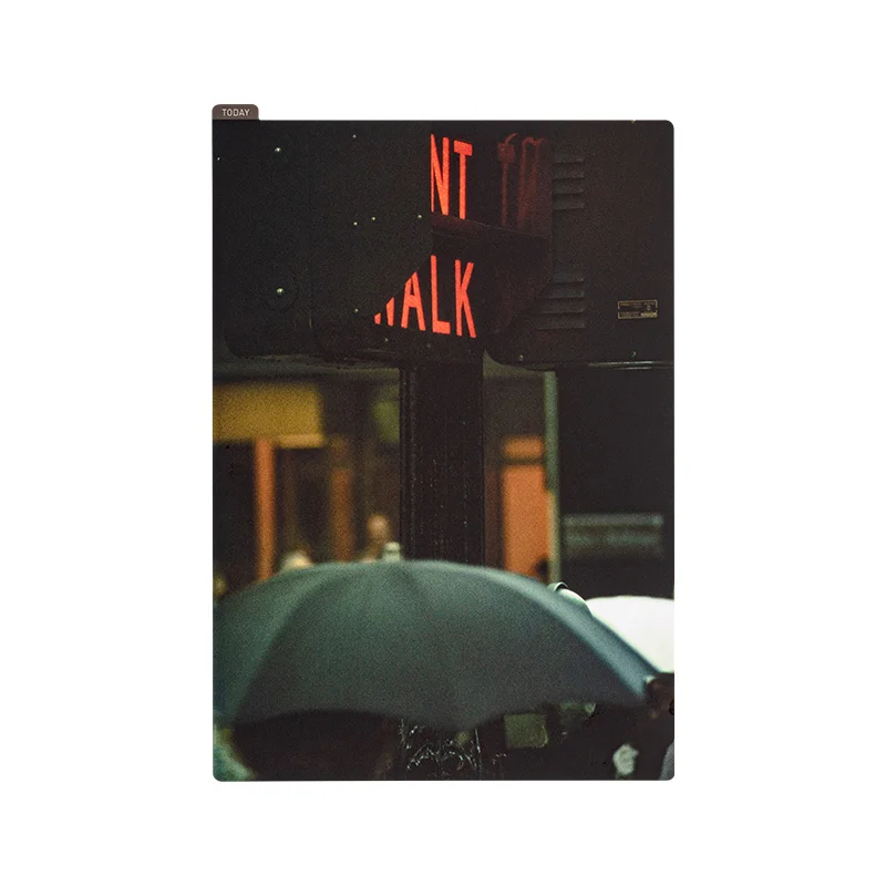 The front fully prints photographs of New York in the 1950s. The A5 size features Don’t Walk, 1952, a photograph with an interesting contrast of the red lights that shine on a dark screen and a green umbrella. It takes you to a different world by simply gazing at them, and allows your imagination roam free.