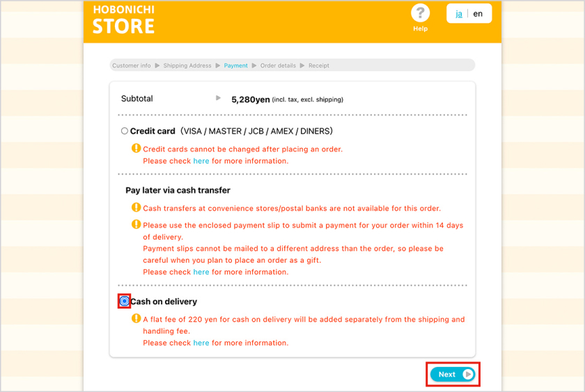 An additional handling fee of 220 yen will be added to the order. Cash only. Some products may not be eligible for cash on delivery.