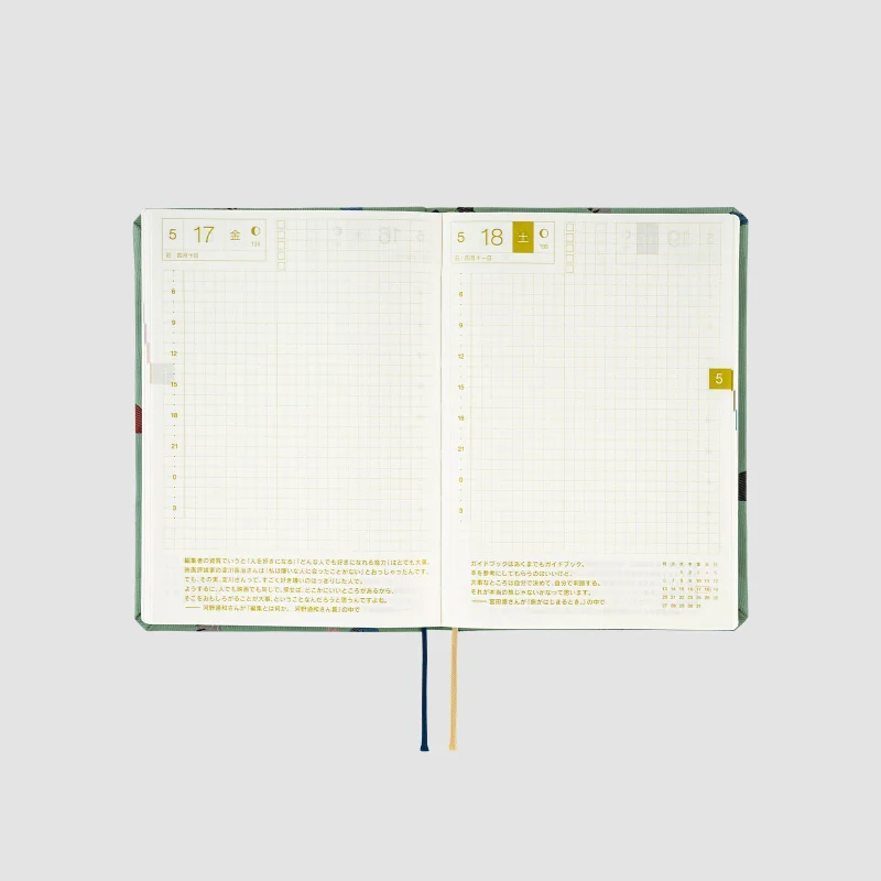 The Hobonichi Techo HON has a hardcover design already attached to the book. It’s designed to make you feel like you’re carrying around a favorite book, which you can pull out at any time to make notes no matter where you are. The book has A6 size pages and features a page per day, so the contents are the same as the Hobonichi Techo Original.