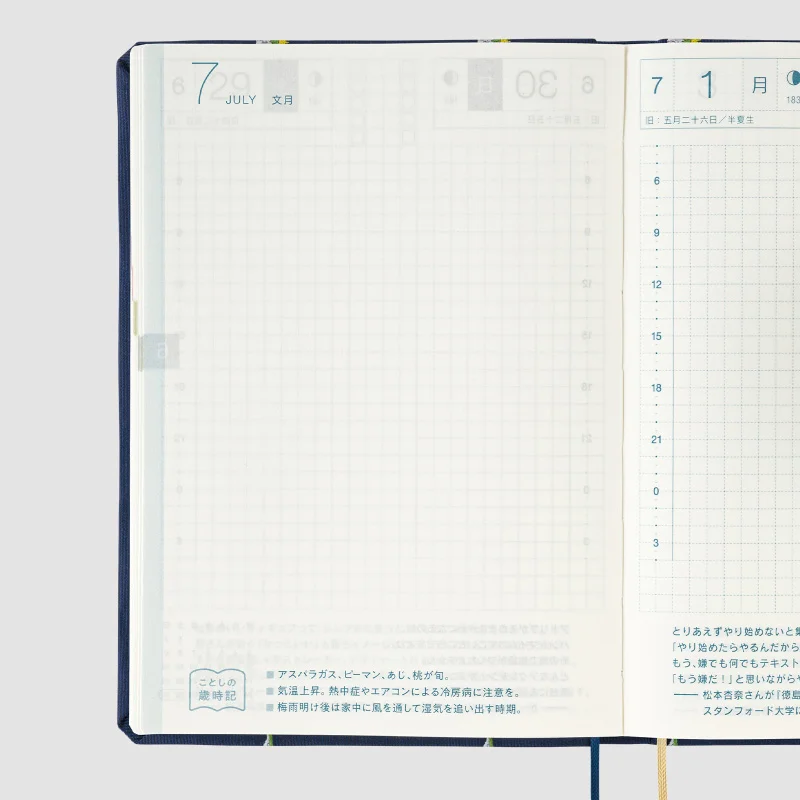 The Hobonichi Techo HON has a hardcover design already attached to the book. It’s designed to make you feel like you’re carrying around a favorite book, which you can pull out at any time to make notes no matter where you are. The book has A6 size pages and features a page per day, so the contents are the same as the Hobonichi Techo Original.