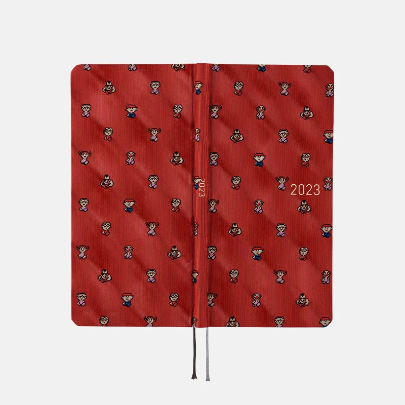 My Friends is made from the same fabric used in neckties. The cover is deep red and finely embroidered with characters from the first installment of the MOTHER series, including the main character Ninten and the other characters he befriends on his adventure: Loid, who is shy but smart; Ana, who is kind and has mysterious powers; and Teddy, a ruthless gang leader who was kind as a boy.