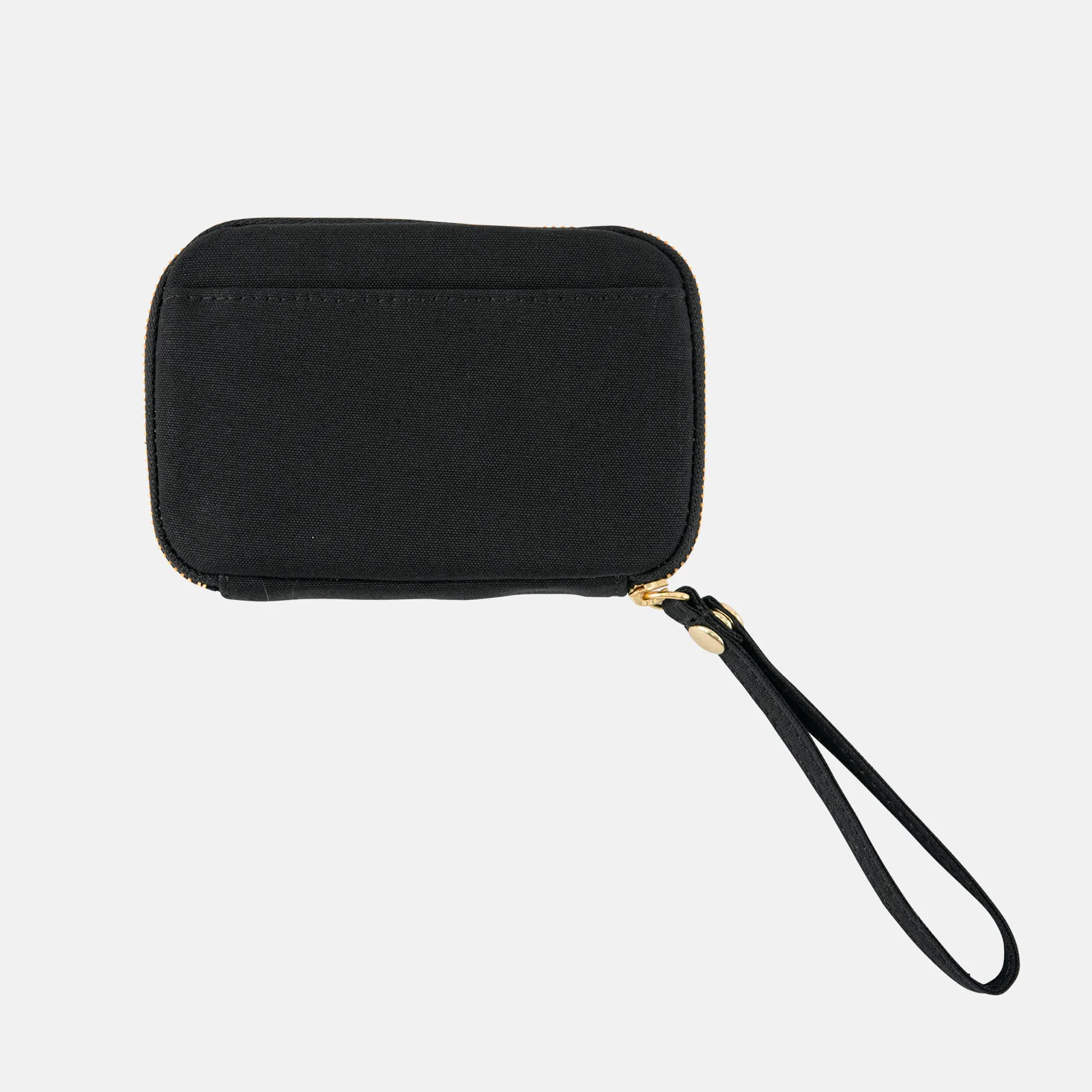 This design features a black cotton material that matches well with any other belongings or bags, and contains a beige interior to complete its nice, subtle look. The zipper pull contains a looped strap for easy handling.