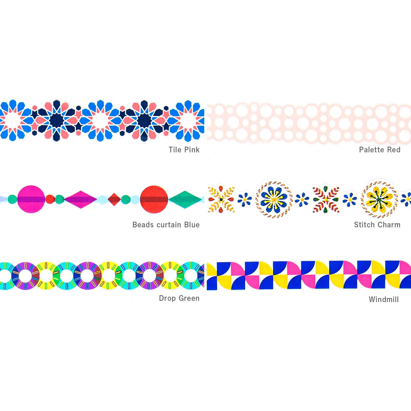We selected five designs: the “Standard (Tile Pink),” “Palette (Palette Red)” and “Stitch (Stich Charm)” from the lineup of 15 mm rolls and “Drop Green” and “Beads Curtain Blue” from the “Mini” series with 10 mm rolls.