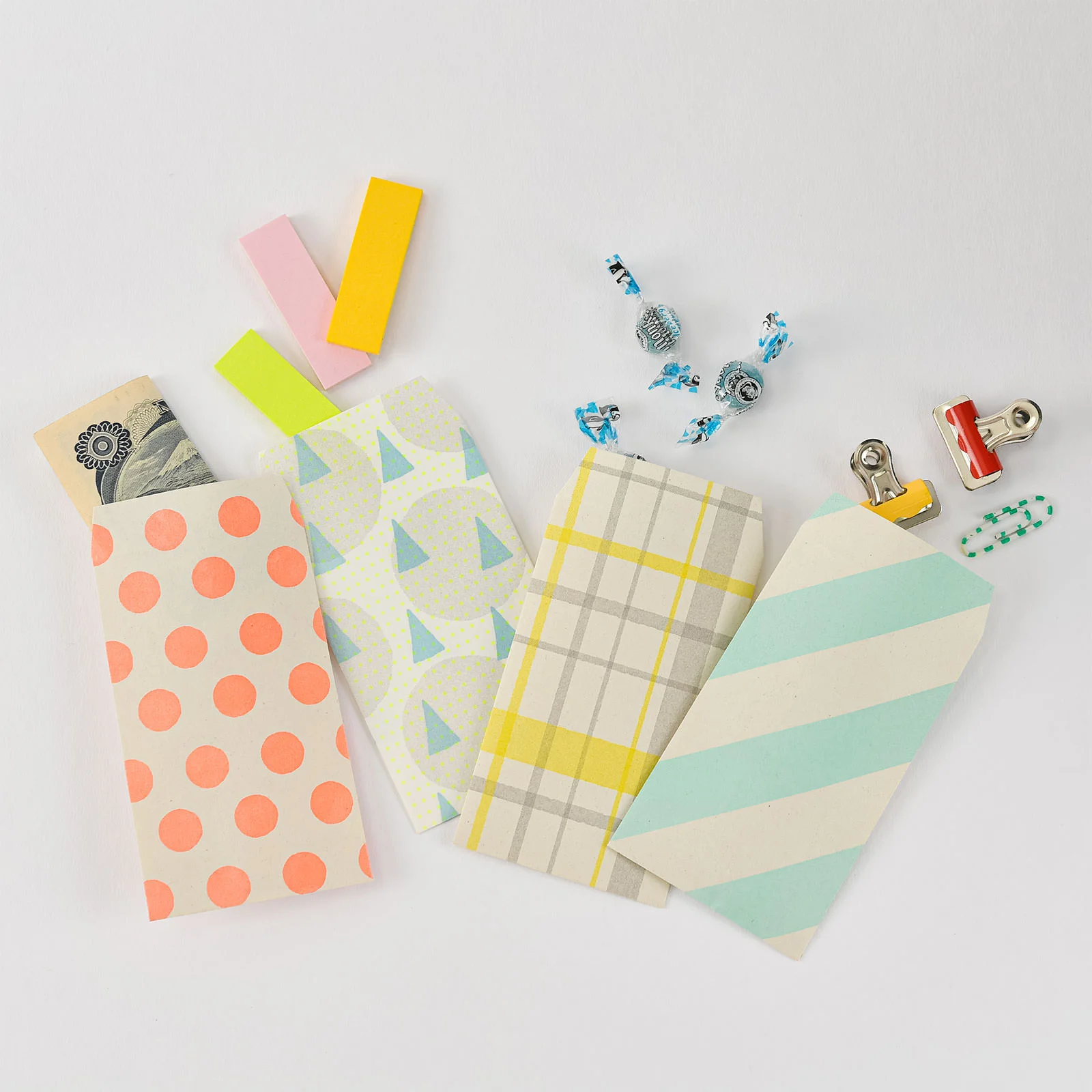 Mini Envelope Set (Straw Paper) uses textured paper that gives off a unique warmth. Three different color schemes are included: the cute polka dots of Flourescent Orange, the refreshing diagonal stripes of Mint, and the fashionable overlapping of colors in Gray x Yellow.