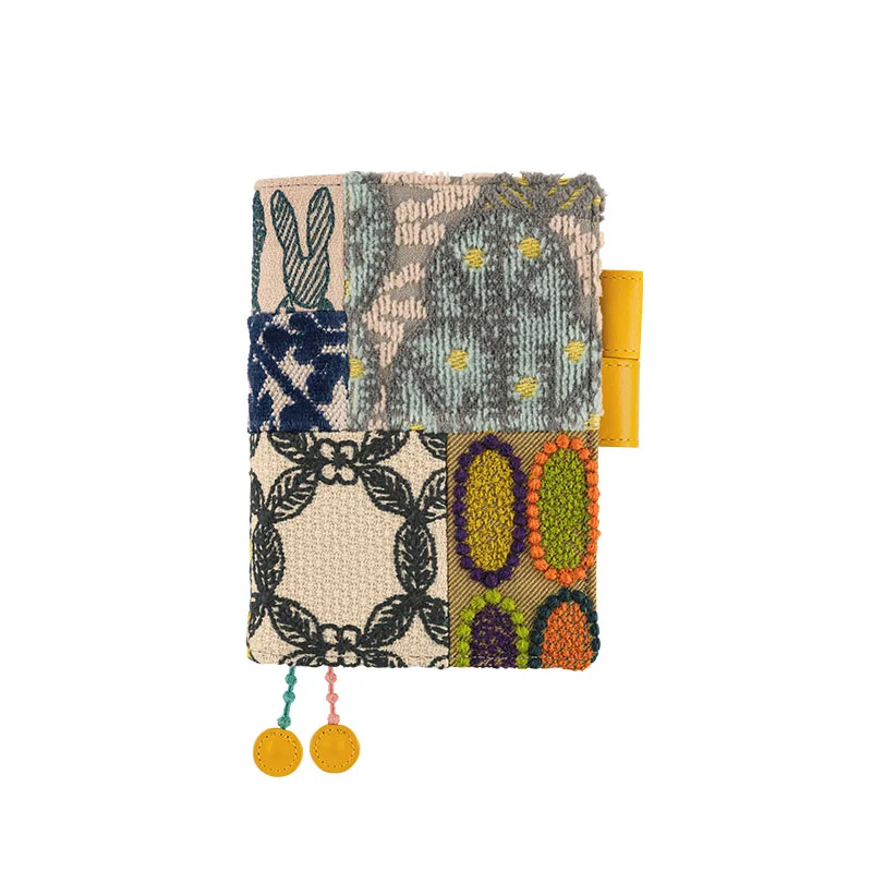 We created a techo cover using two textiles: “jellybeans,” which once appeared in the Hobonichi Techo lineup, and “tambourine,” which has been popular among many. The playful design features two shapes of “circles” that happily overlap: the fluffy, sweet-looking watercolor drops and embroidered dotted circles.