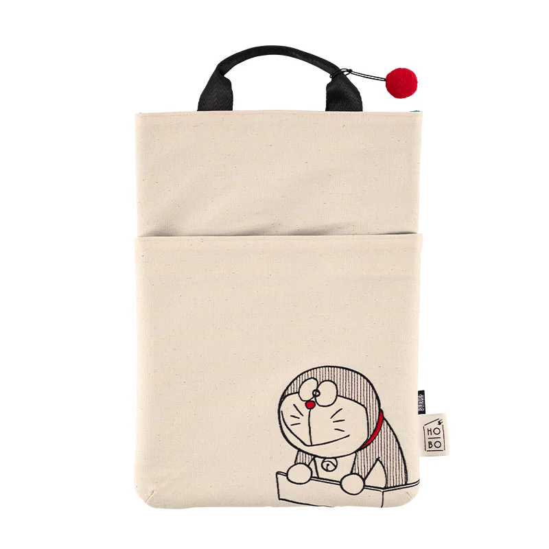 The outside uses a simple ecru canvas material, but open the bag to reveal vivid Doraemon-like colors. The handle is a black nylon belt that’s thick enough to hold comfortably. The bag also contains a round charm to evoke Doraemon’s tail. Attached to the bag is a black tag with the logo “Doraemon” in white for a nice accent.