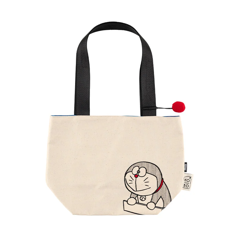 The outside uses a simple ecru canvas material, but open the bag to reveal vivid Doraemon-like colors. The handle is a black nylon belt that’s thick enough to hold comfortably or easily drape over your shoulder. The bag also contains a round charm to evoke Doraemon’s tail. Attached to the bag is a black tag with the logo “Doraemon” in white for a nice accent.
