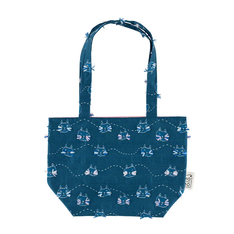 Whisker Cat places stitched images of cute cats and wavy lines against a deep blue background. The cats’ whiskers are made with white, pink, and light blue threads that have been cut one by one to the perfect length so you can enjoy the feel of the 3D effect against your fingertips. Look closely and you’ll see the faces of the cats vary, including some with wide eyes and some with narrowed eyes. The bag interior has a lustrous pink material to provide a charming contrast against the blue every time you open the bag.