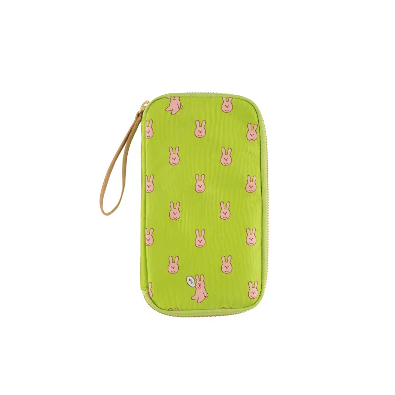 This pouch is dotted with Suki-Usagi, a popular character created by manga artist, illustrator, and animator Q-rais. The material uses the same textured, shiny fabric used in neckties, and Suki-Usagi is featured with a variety of charming expressions and poses. The background color is a vivid lime green.