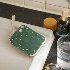 Makino Collection: Desk Garden is a soft, silky green fabric dotted with pink flowers. What makes it unique are the soft white spots that are sewn into the fabric. These white puff-balls are not sewn into the textile afterwards — they’re included at the time of manufacturing, so as long as you do not pull at the fabric too strongly, these spots will not fall off of the cover. The color of the interior is white.