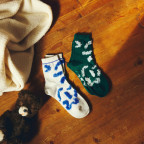 Unlike the pajamas with prints on organic fabric, socks are made of stretchy knitted fabric. In collaboration with Tricoté, a lifestyle brand that offers products made from knit fabrics, we used knitted fabric to express the pattern using yarns of different textures. They come in two colors: white and blue, and green and white.