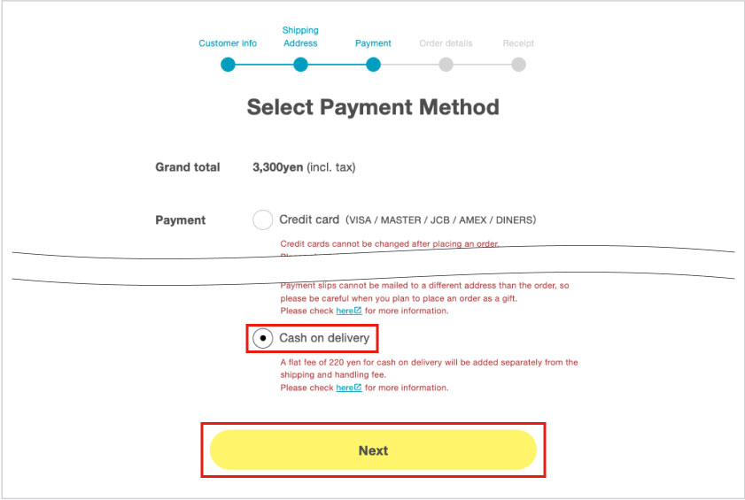 An additional handling fee of 220 yen will be added to the order. Cash only. Some products may not be eligible for cash on delivery.