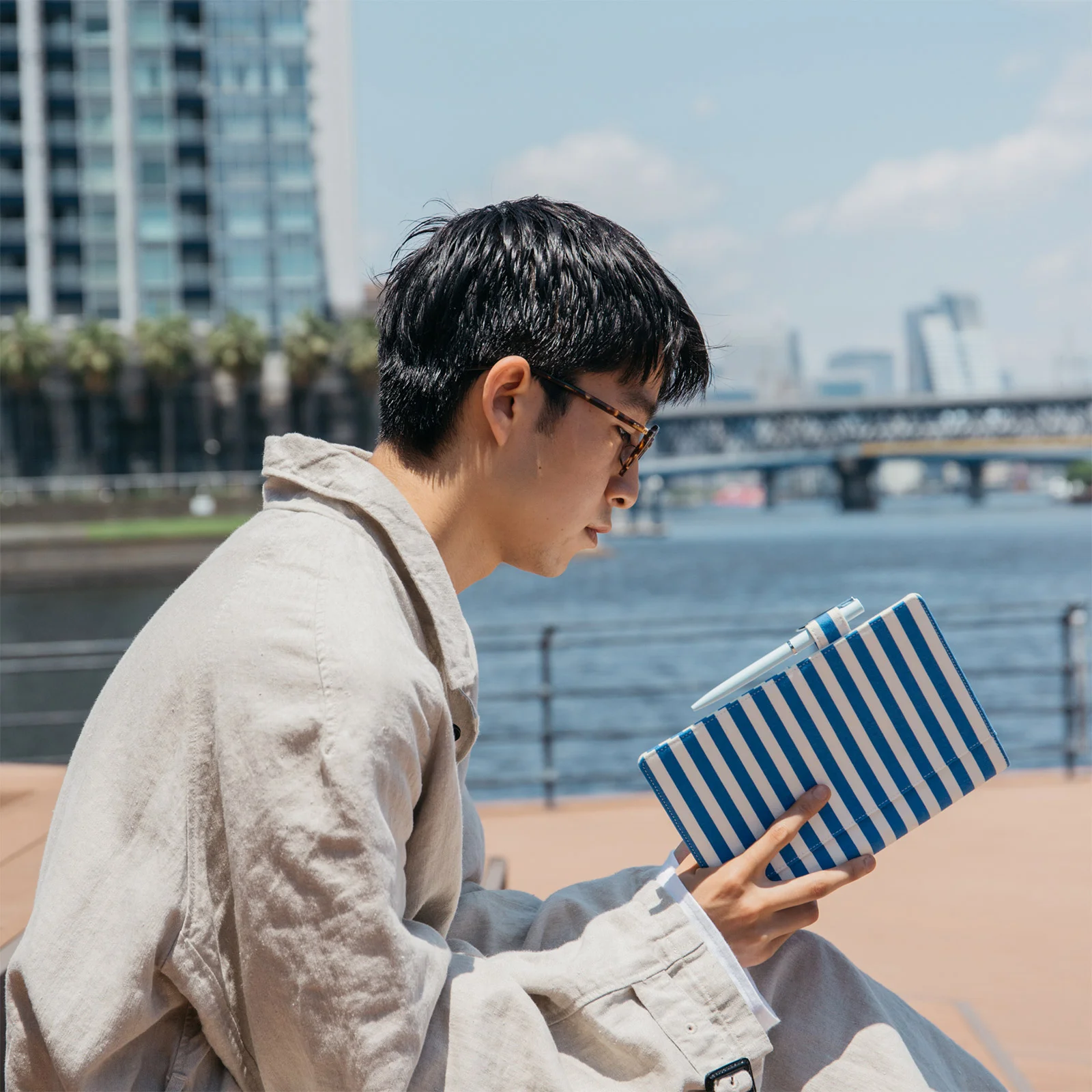 Marine Stripes uses Japan-made cotton sailcloth that’s sturdy and lasts a long time. The material softens as you use it over time, so you can enjoy the way the texture changes. The fabric is treated with a water-repellent finish that can repel a modest amount of water. If you’re at a place where it’s easy to accidentally get your cover wet, such as setting it down on a wet spot on a cafe table, if you wipe off the cover right away it won’t get stained. (The finish is not waterproof, so an excess amount of water may penetrate the gaps in the cloth texture.)