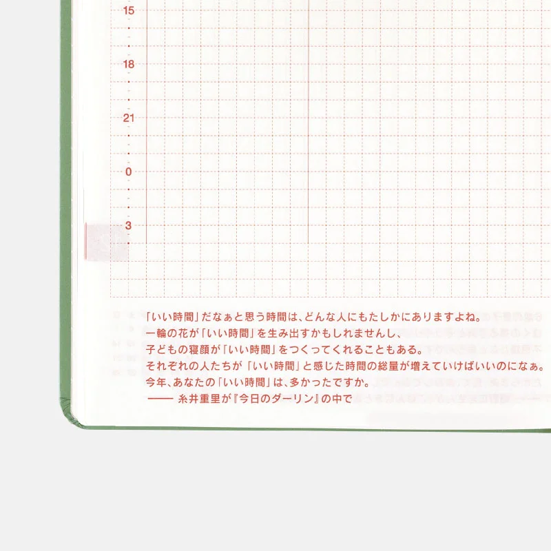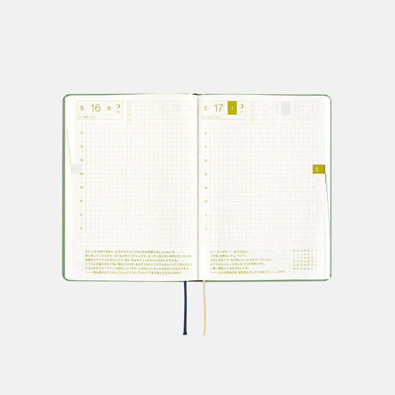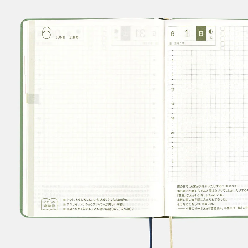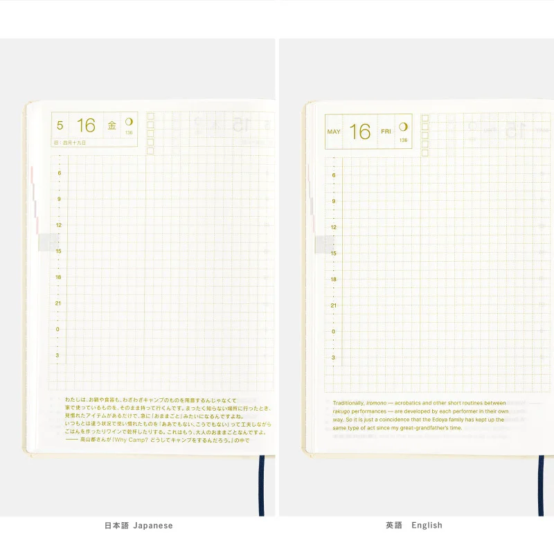 | Bonus Pages | Time Table / Graph Paper / Favorites / My 100 / Sample Symbols and Icons / How to Have Fun Keeping a Diary / Recommended Noodle List of 47 Prefectures / Solar Terms / Emergency Preparedness / Conversion Chart / Getting the most of Hobonichi / Gifts / Age Table / Addresses (for 6 people) / Personal Notes |