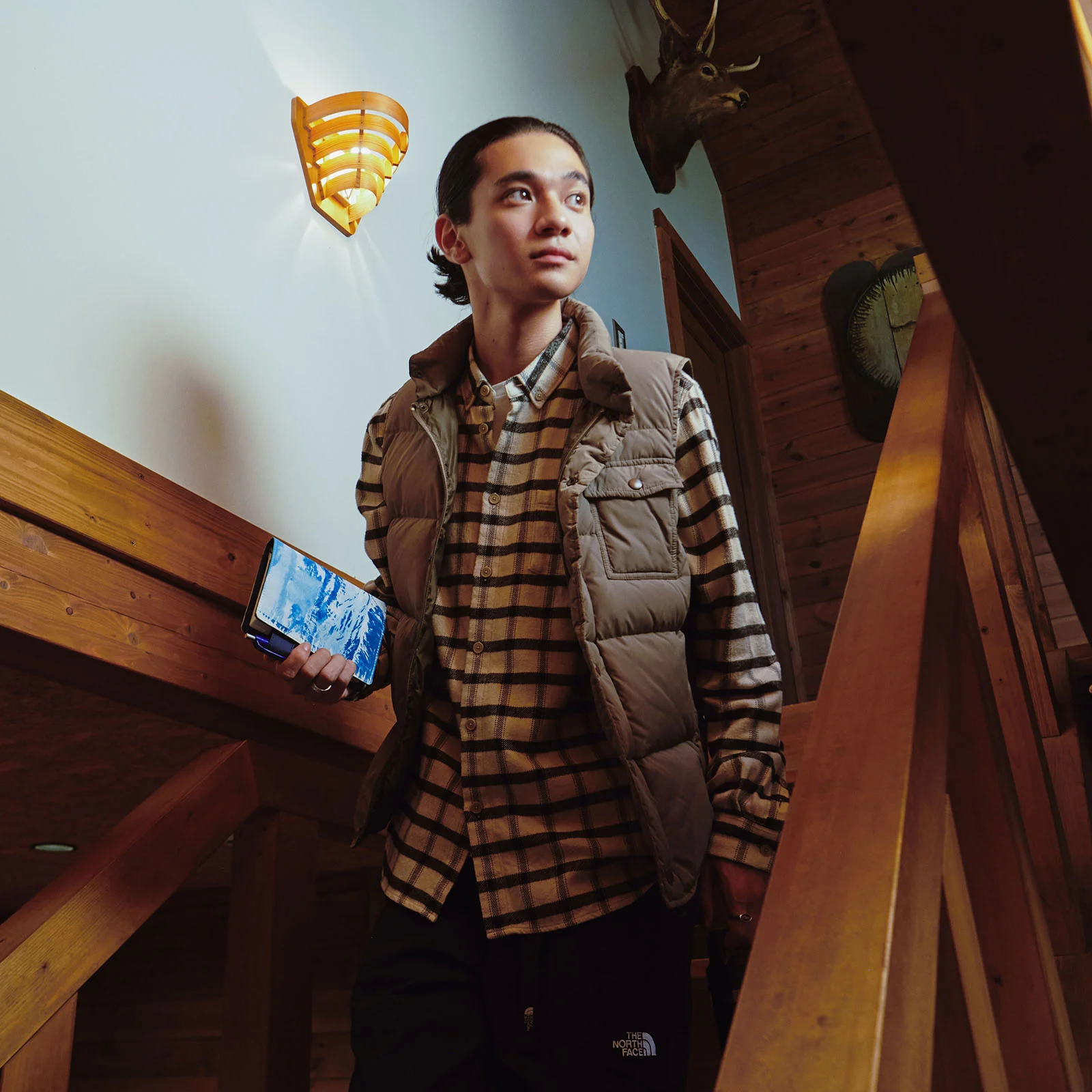 This photo, capturing the full extent of Mount Denali at 6,190 meters above sea level, was taken from inside a Cessna heading towards base camp for the summit. The view of the mountain composed of deep blue and white looks like a watercolor painting at a glance. This photograph is processed with cyanotype, which is a photographic process that involves a chemical solution and exposure to UV light. The appeal in this design comes from the brush marks that let you see where the solution was applied.
