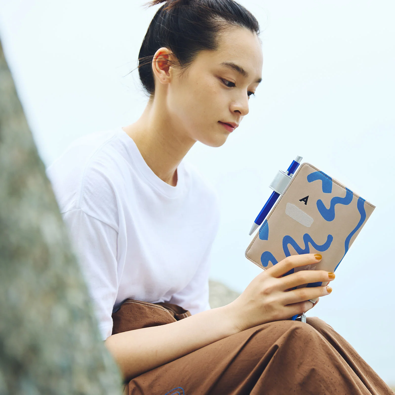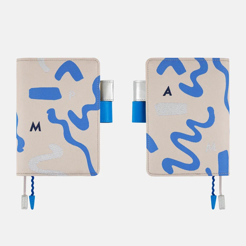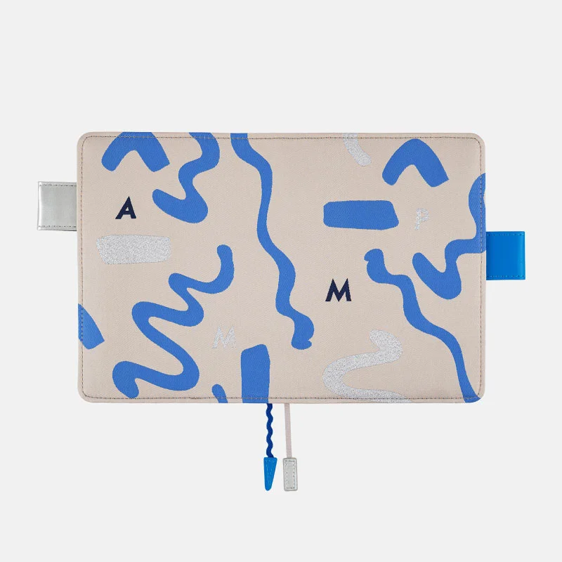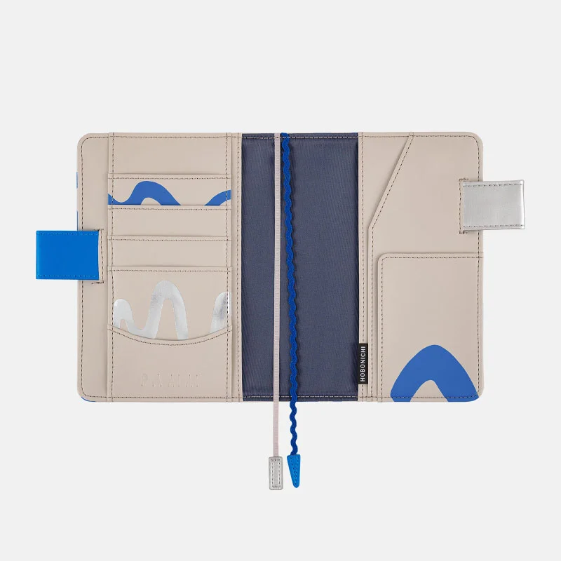 The beige faux leather interior includes a pocket with a playful element. The wavy blue lines are silk-printed, and the curvy silver lines are foil-pressed for an elaborate look.