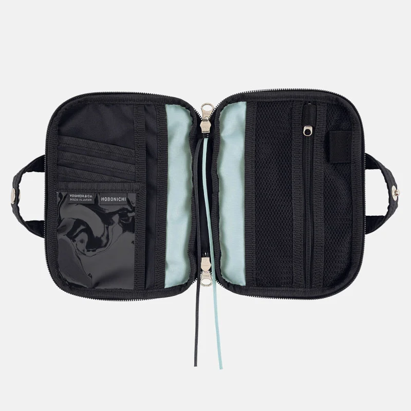 Open the zipper and you’ll see the combination of black and blue gray for the cover interior. There are three card pockets and an additional, deeper pocket that’s clear so you can see what’s inside; there’s also a mesh pocket that closes with a zipper. You can carry everything you use on a daily basis alongside your techo. The pen-holder can store a slim pen; if you’ve got a thicker pen, you can store it by its clip.