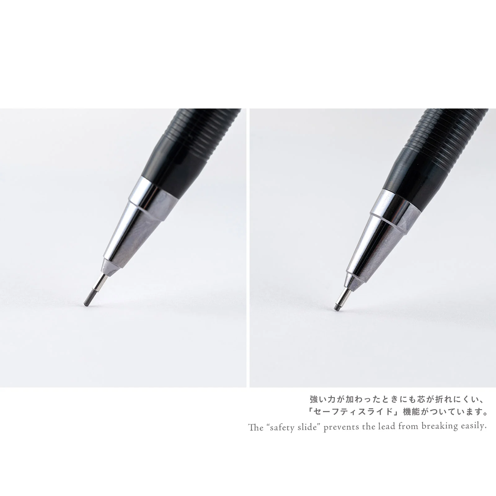 Platinum PenPress Man0.9mmThis mechanical pencil has 0.9 mm, 2B lead that’s an original product of the pencil and writes especially smoothly. The “safety slide” on the pencil tip allows users to put pressure into the pencil without worrying about breaking the lead. And while traditional lead refills are usually about 6 cm long, the Press Man lead refills are 10 cm long and last much longer.