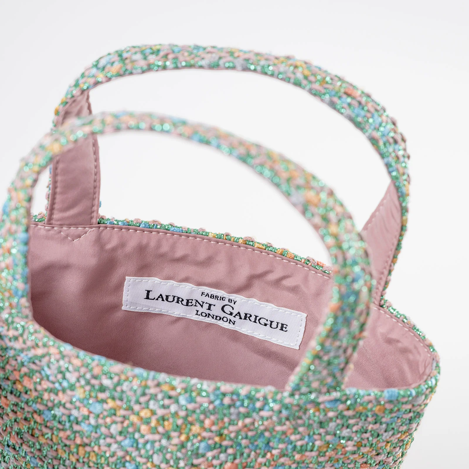 The base is a shimmering green glitter thread, which befits the name “Twinkle,” and is tightly woven with threads in nuanced colors of pink, blue, lavender, and other colors. This textile has a three-dimensional feel, and the threads are not only in different colors but also in different thicknesses. It looks like a field of flowers or city lights, which you will never grow tired of looking at. The interior is a classy mauve color. It also has the Laurent Garigue tag attached.