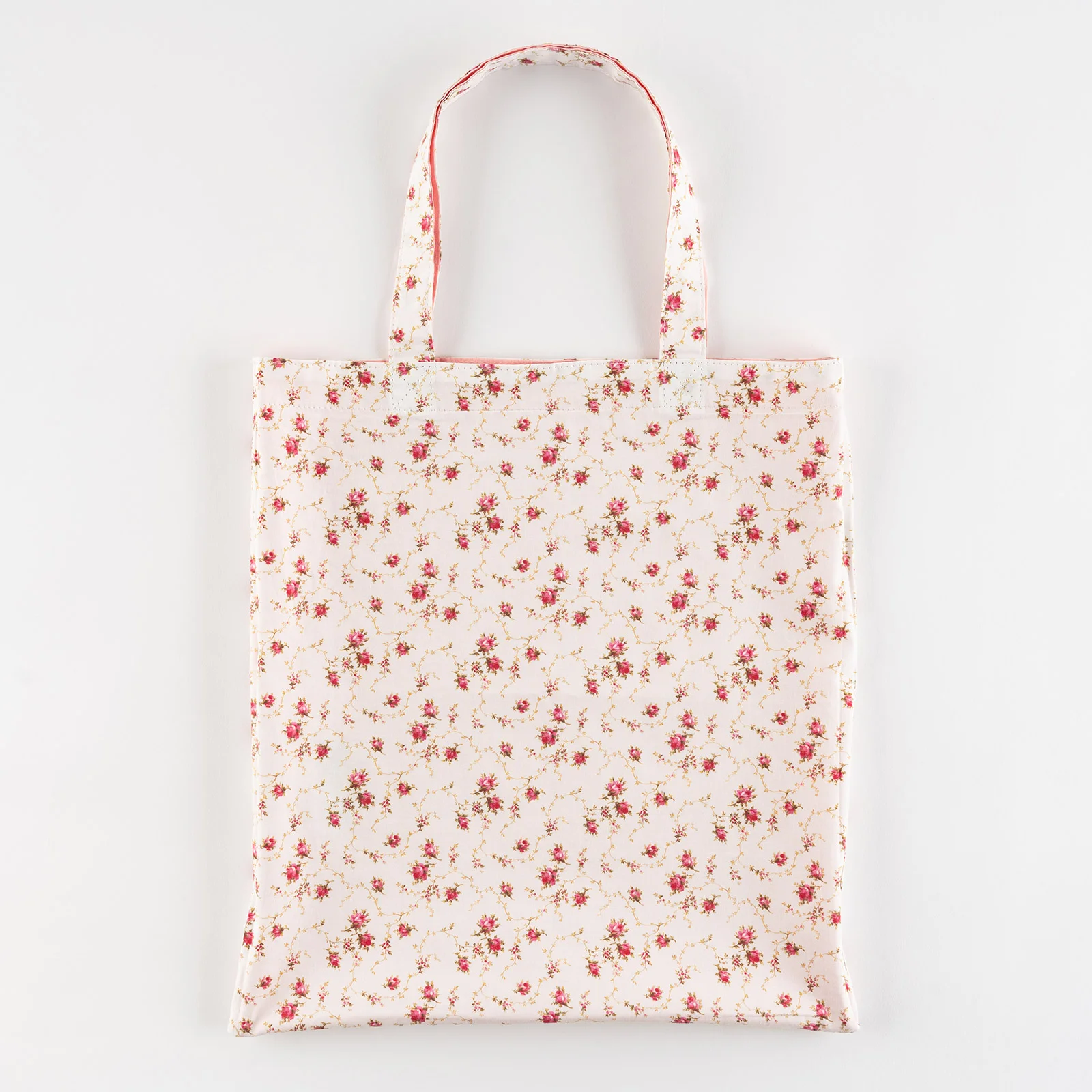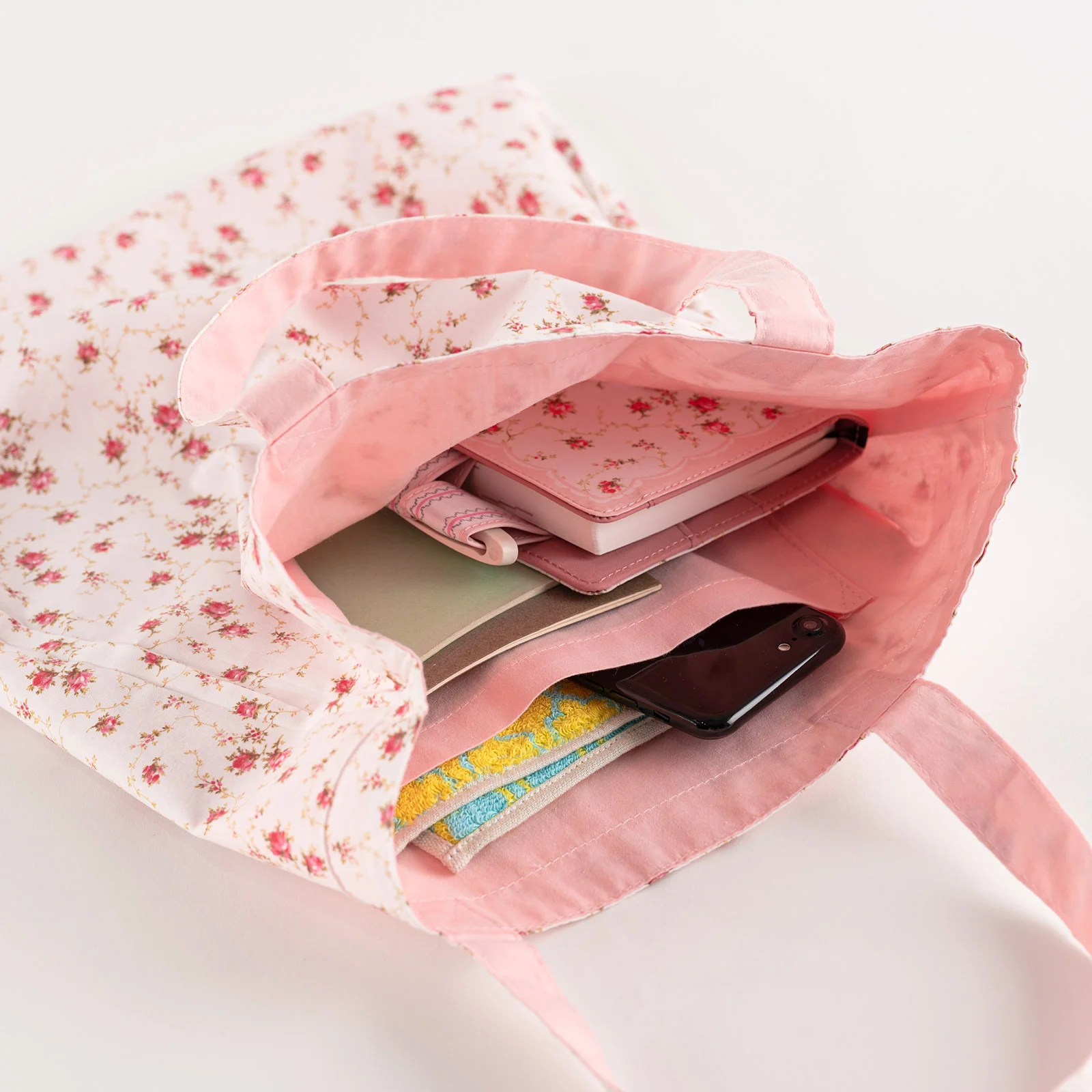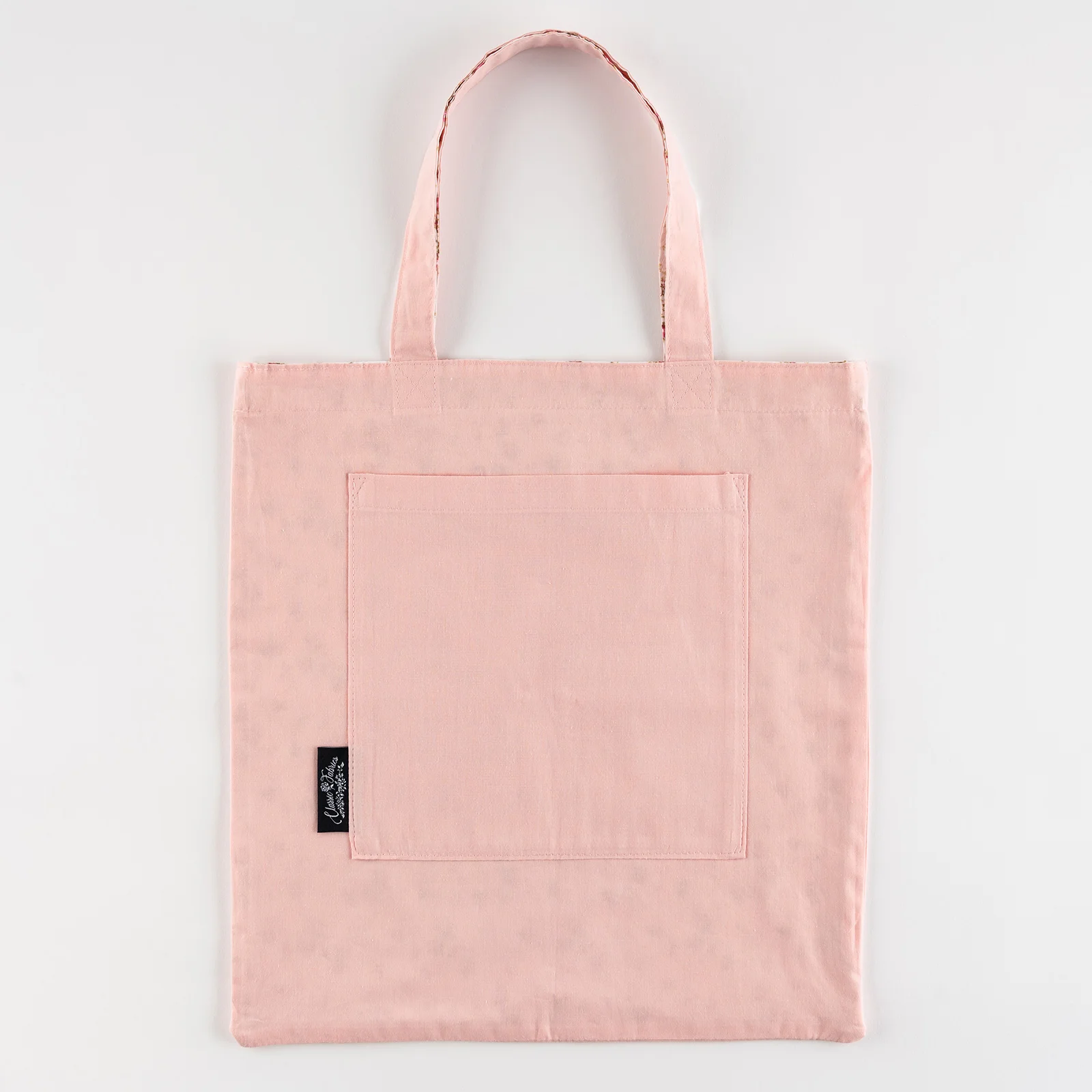 The tote bag is reversible, with the front blooming with roses and the back with a calming pink. The pink side includes a large pocket to sort your bag inside.